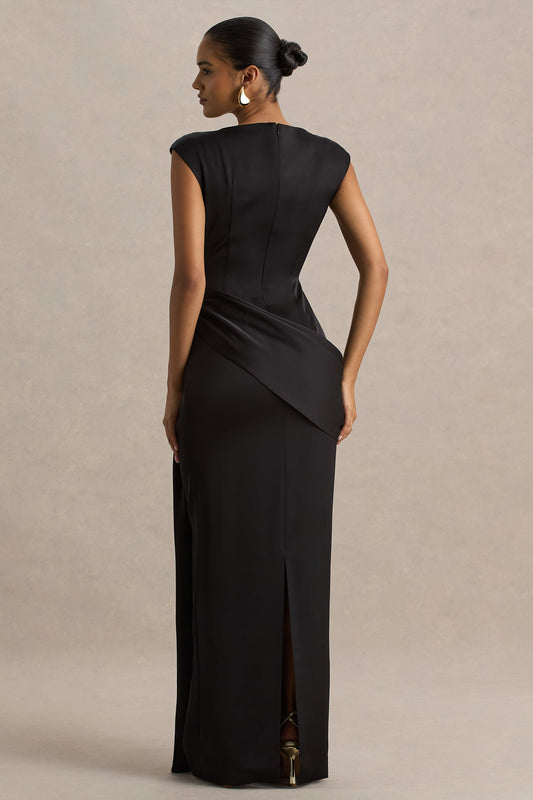 Dynasty | Black Asymmetric-Neck Maxi Dress With Ruched Detailing And Front High-Split