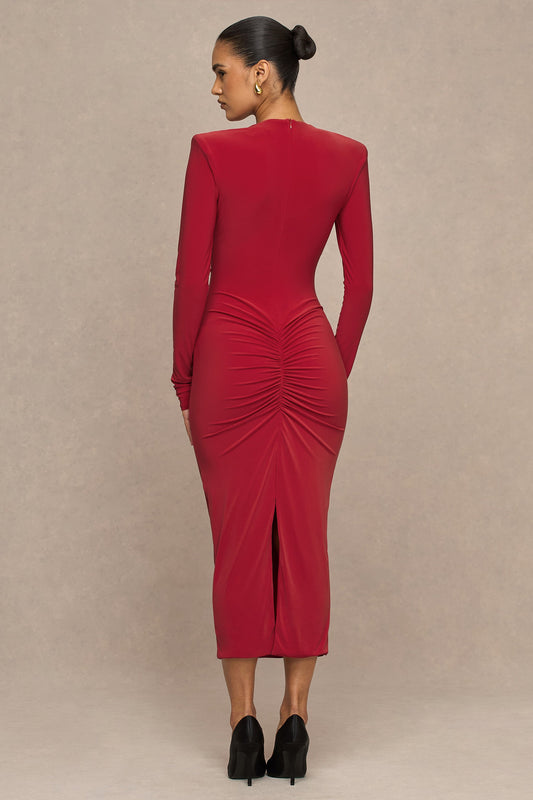 Serafina | Red Extreme-Plunge Maxi Dress With Ruched Detailing And Open-Back