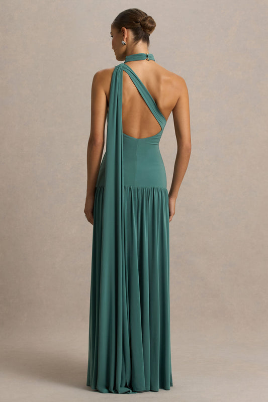 Freesia | Teal Asymmetric-Neck Maxi Dress With Scarf-Detail