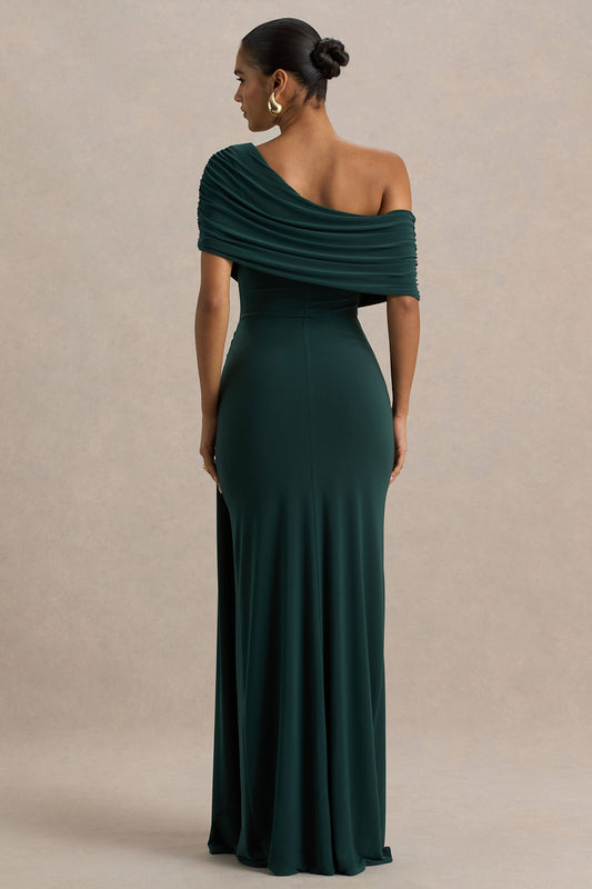 Dynasty | Dark Green Asymmetric-Neck Maxi Dress With Ruched Detailing And Front High-Split