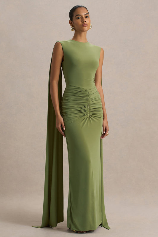 Premiere | Olive Boat-Neck Maxi Dress With Cape-Sleeves And Open-Back