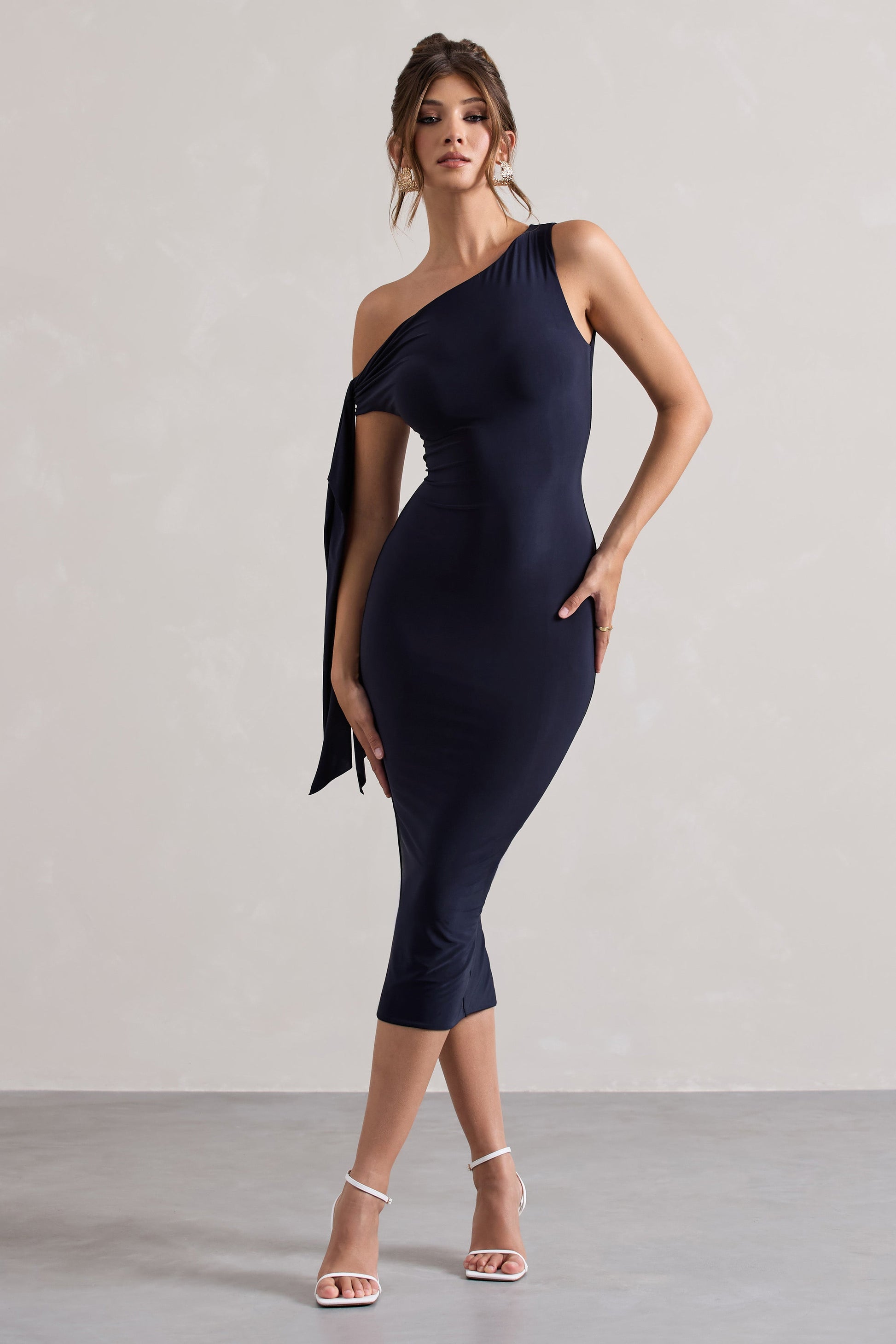 Simple yet sophisticated, Adapt is a timeless addition to every wardrobe. Carefully designed in a premium jersey thats super-soft to the touch, this navy blue midi was made to fit you like a glove. Defined by an asymmetric neckline highlighted by a tied drape detail, Adapt would look best styled with a sleek bun to show off all its features.