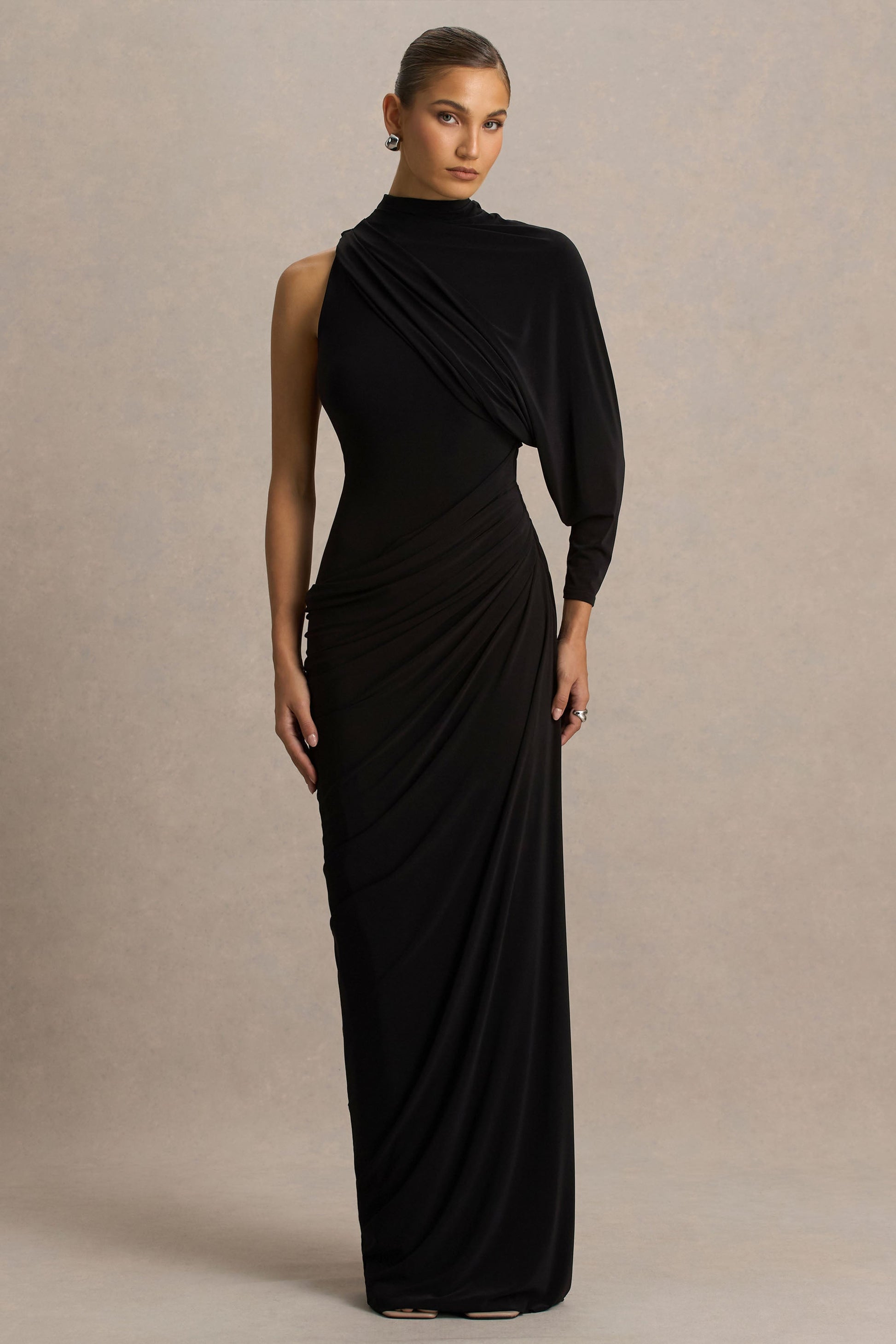 Made for statement-making moments, Aphra is the definition of quiet luxury with a bold twist. Cut in a bold black hue of our premium stretch jersey and flowing to a graceful maxi length, this gown balances chic and sophistication with ease. The high neckline exudes modern edge, while a single cape sleeve adds effortless drama and movement. Finished with draping across the body, Aphra embodies timeless glamour. Style with statement gold earrings to tie the look together.