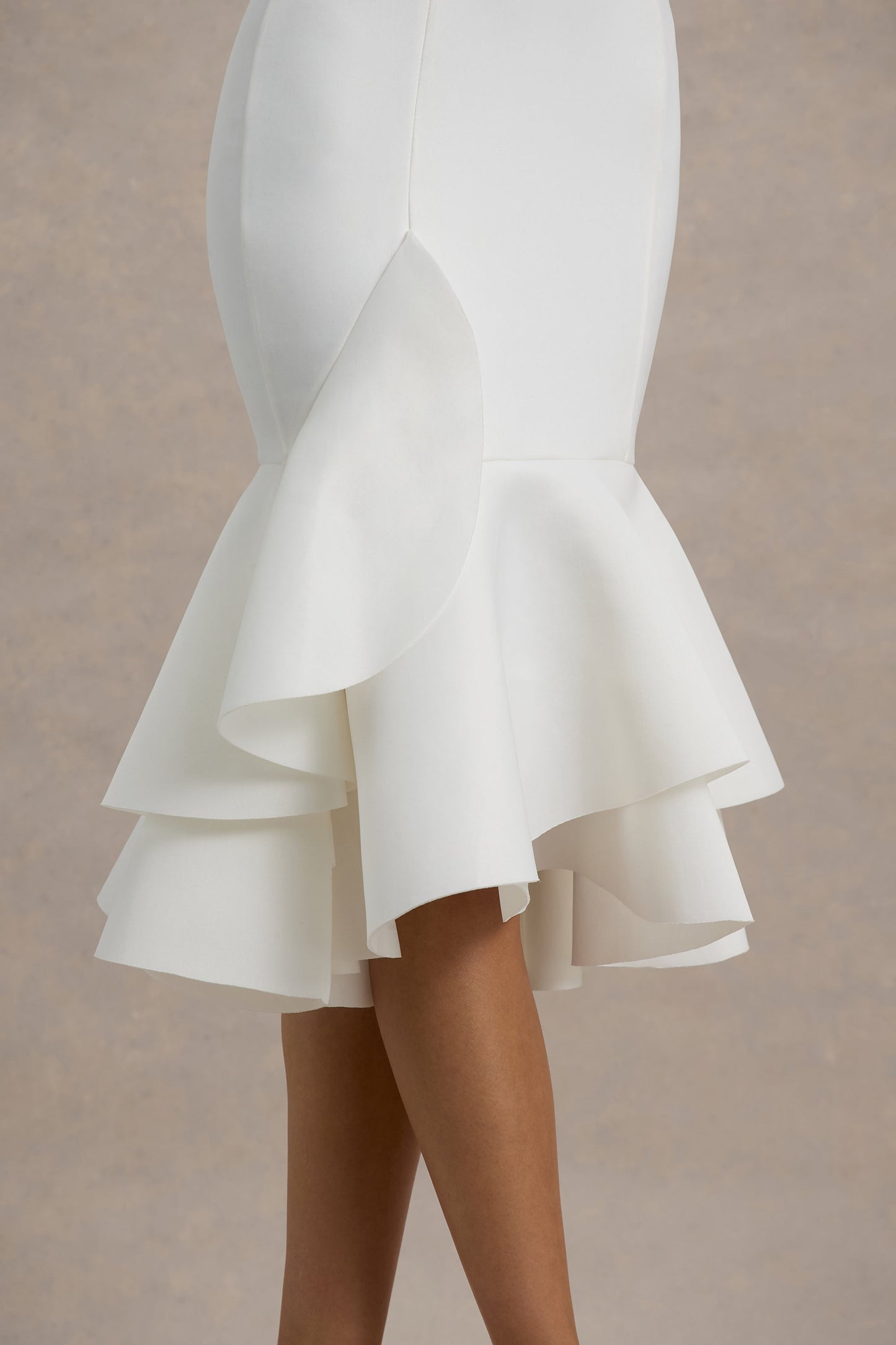Arriving in a new season silhouette, Arla is the perfect piece for any special event. Crafted in a white shade of our signature stretch scuba crepe, this curve-enhancer boasts a self-tie neckline and eye-catching ruffled hemline. For an elevated look, try teaming yours with some sparkling accents and a tousled bun.