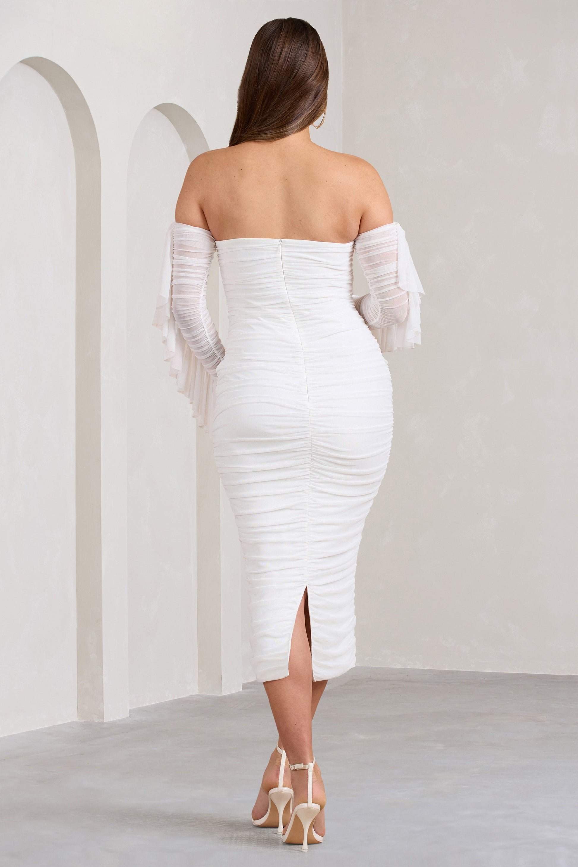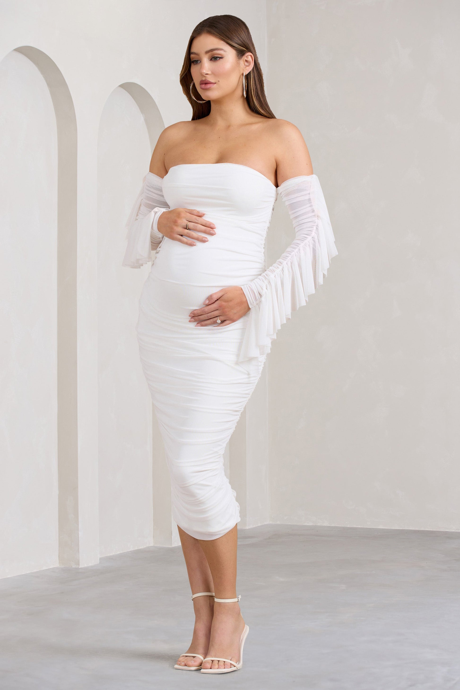 Aroma | White Ruched Mesh Maternity Midi Dress With Ruffled Sleeves