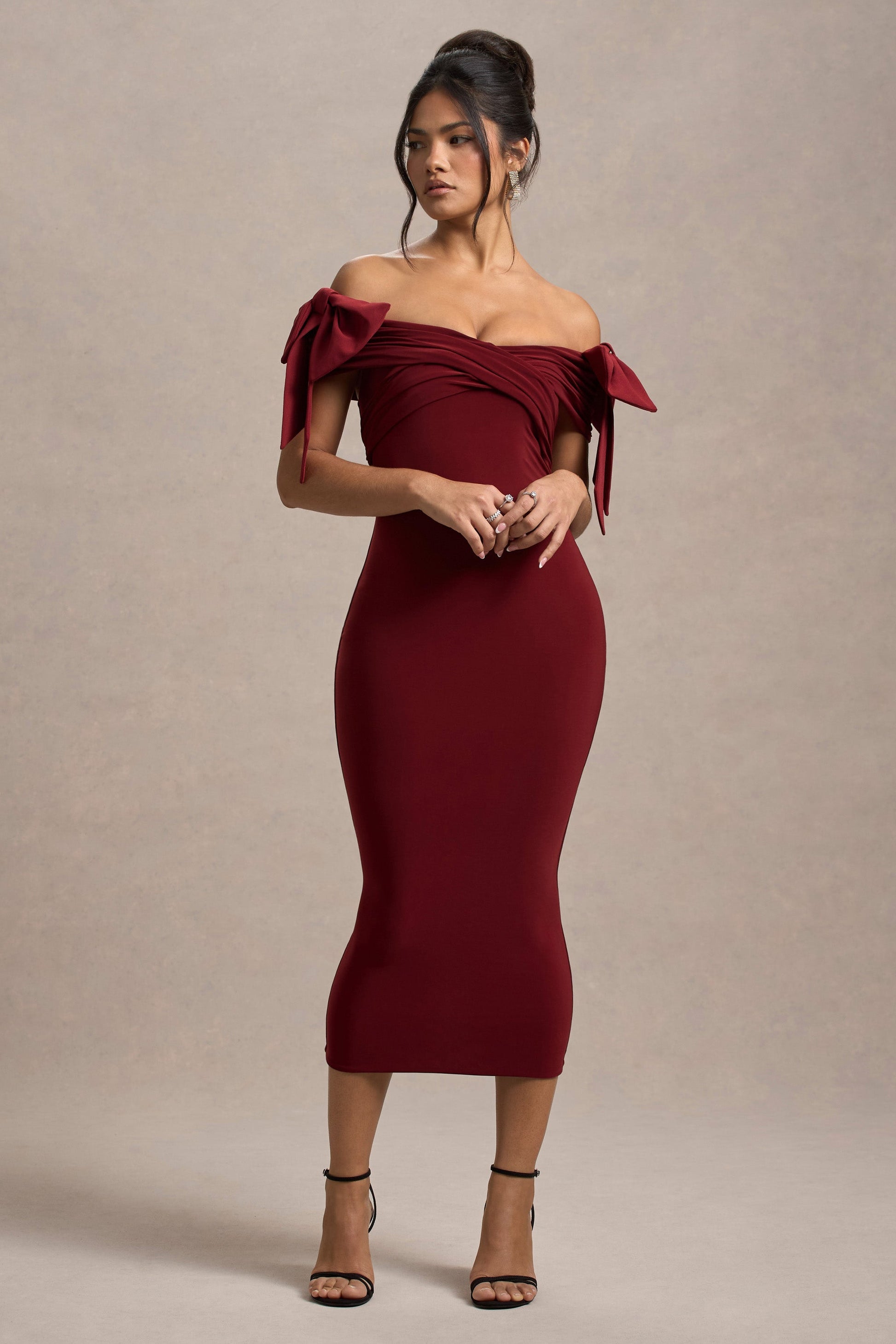Timeless, elegant and glamorous are three words that perfectly describe Ashleigh. Expertly designed in a deep port shade of our curve-enhancing jersey, this midi dress features a classic bardot neckline topped with eye-catching bow trims.