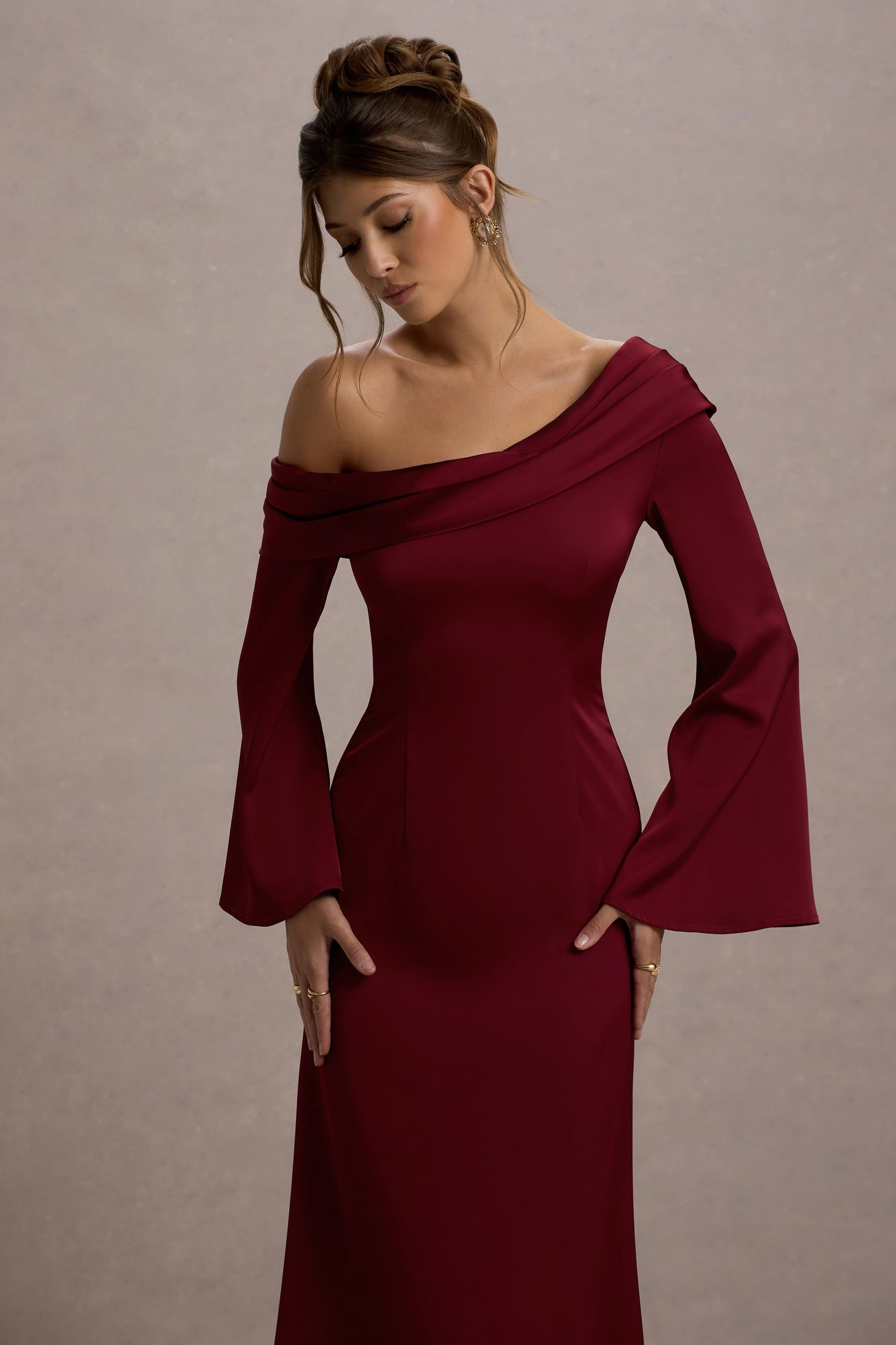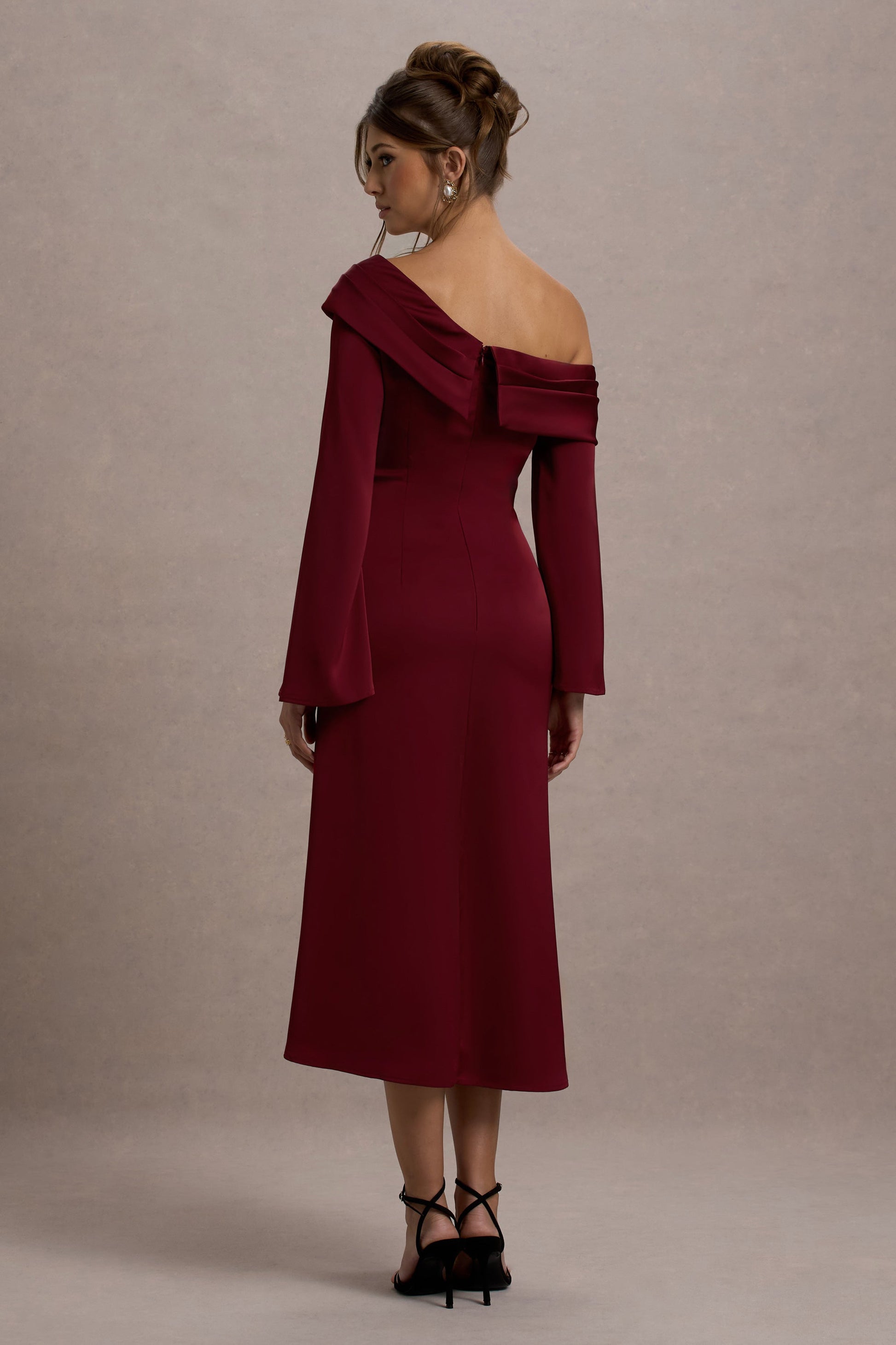 A wardrobe staple, Astral was designed to see you through any occasion. Expertly crafted in a rich port hue of our premium satin, this free-flowing midi is defined by its asymmetric neckline and long, flared sleeves. Elevate yours with some bouncy curls and earrings like Cecille for the perfect formal look.