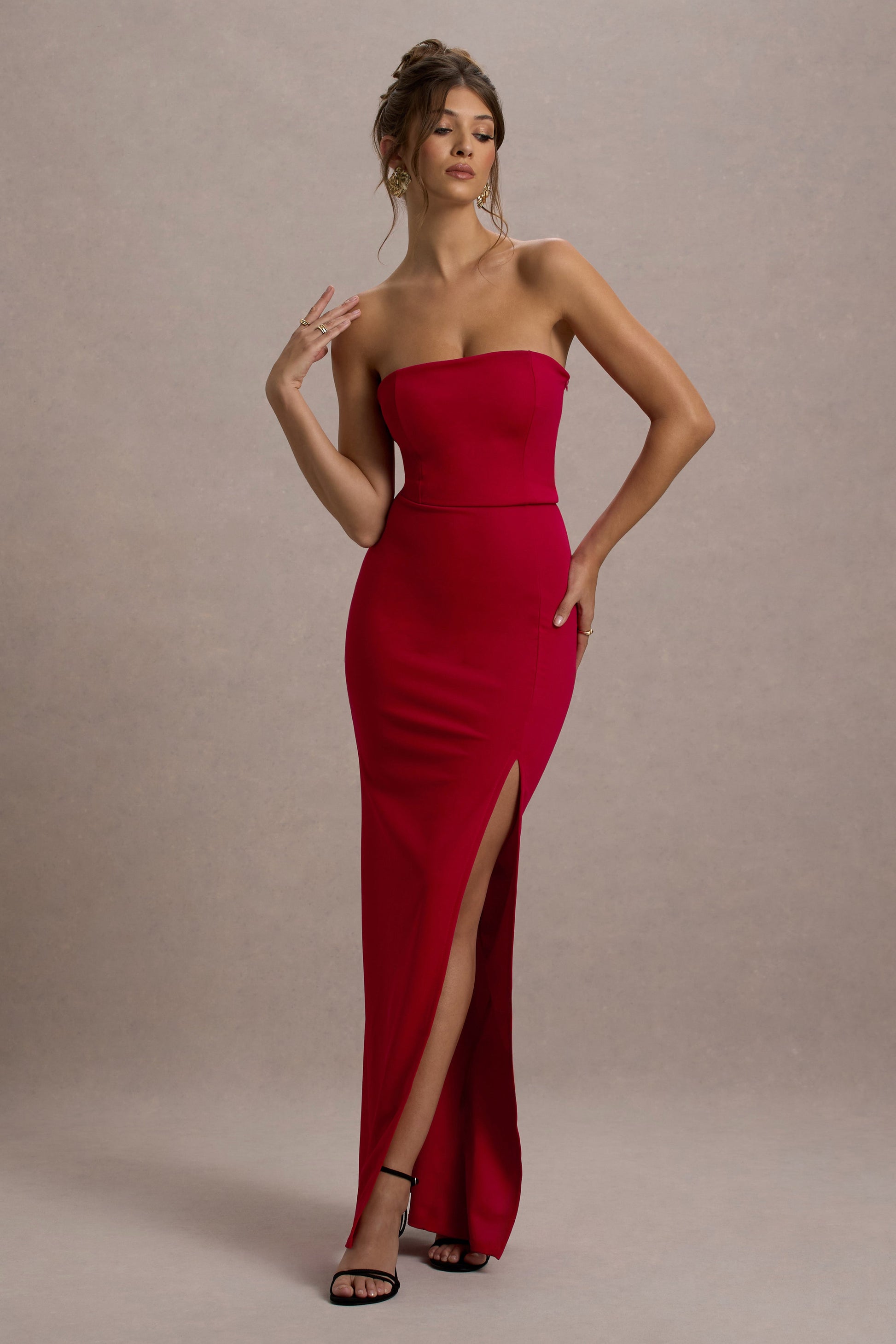 Leave it to Club L to make a sleek dress suited to every special occasion. Cut from sculpting scuba crepe, our red Belle of The Ball maxi boasts a bodycon fit with a strapless bandeau neckline and a theatric thigh split. If you're looking for a figure-flattering wardrobe staple to see you through the party season, look no further than this timeless style.