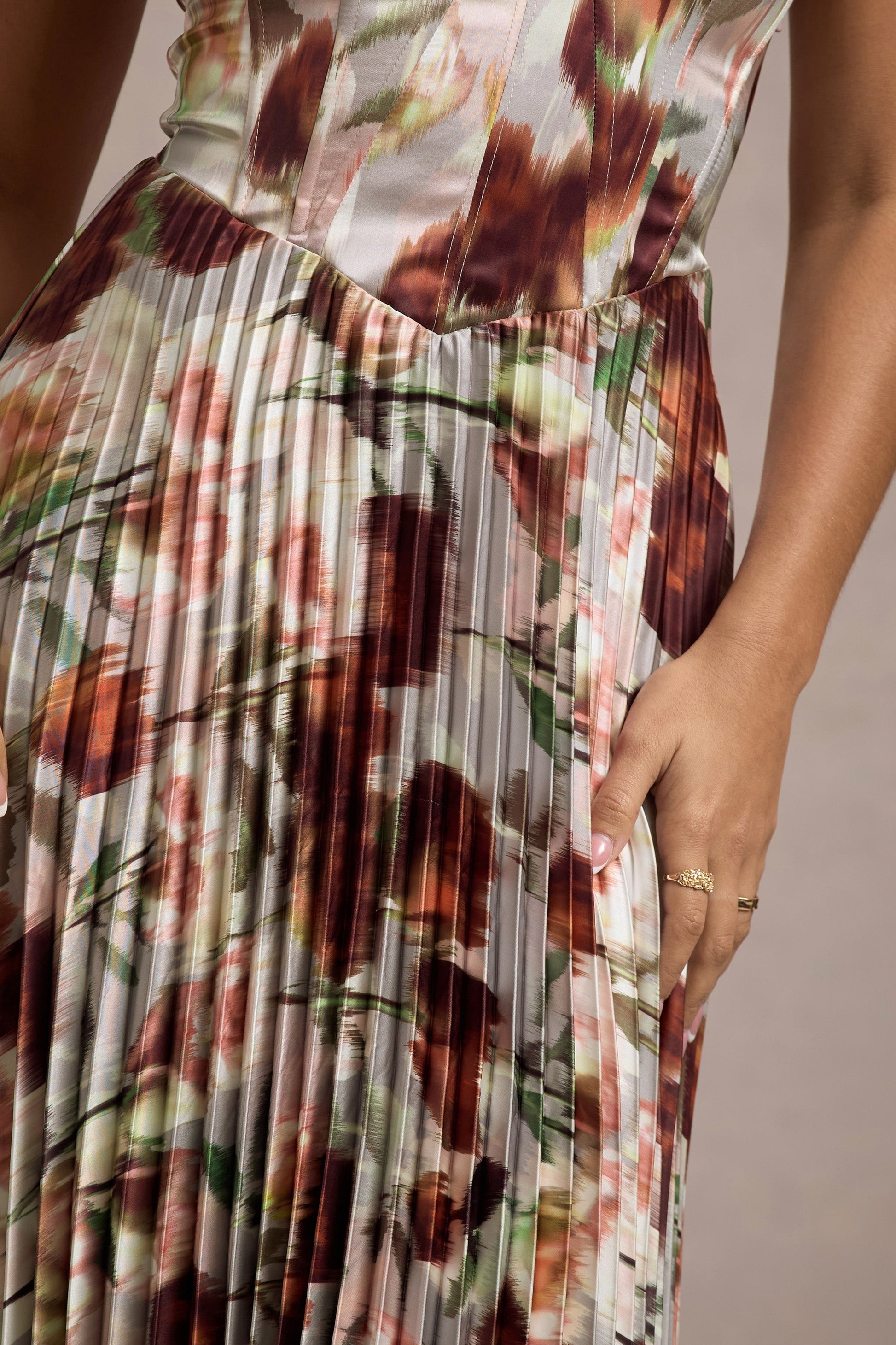 Encapsulate elegance in Bordeaux, our floral midi dress. This dress expertly cut in a premium satin creates a sophisticated feminine silhouette, with a sweetheart neckline and flattering structured corset bodice, the pleated skirt creates a romantic sense of movement. Style Bordeaux with our Hear Me court heels and a sleek bun for a classic look at your next occasion.