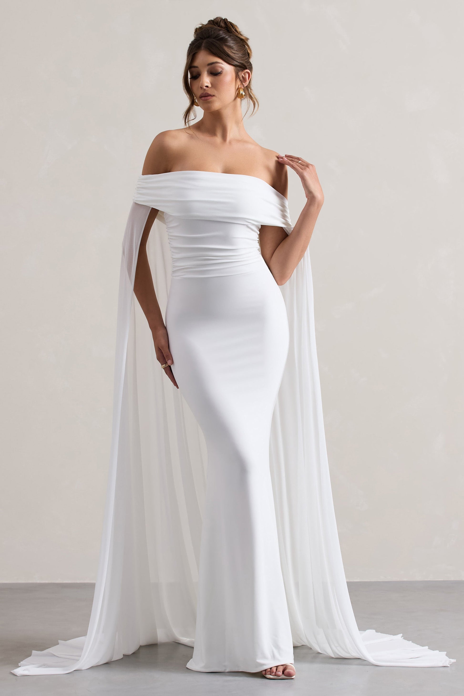 Carlotta | White Bardot Maxi Dress With Chiffon Cape