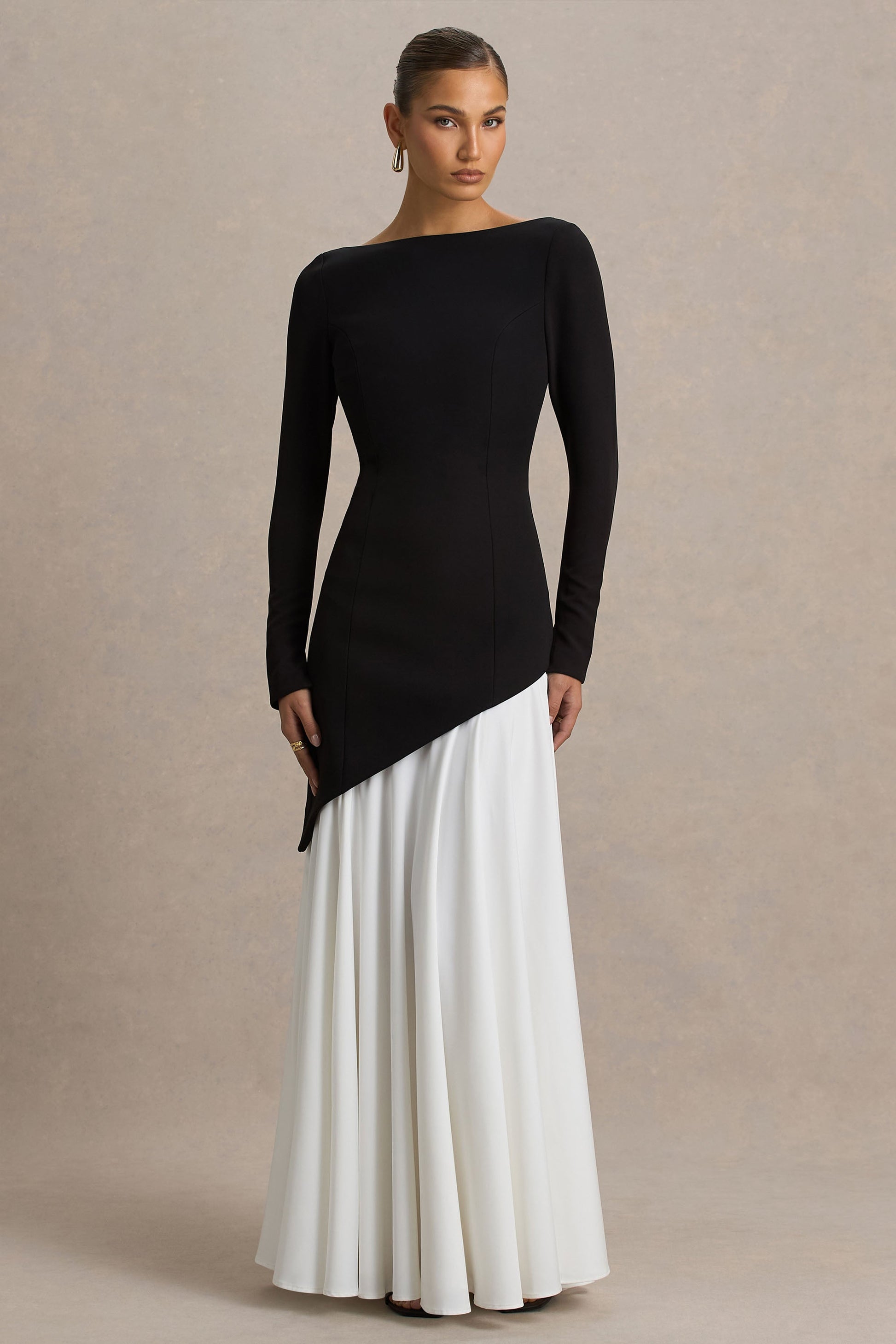 Caty | Black And White Long-Sleeved Maxi Dress With Drop-Waist And Ruffled Detailing