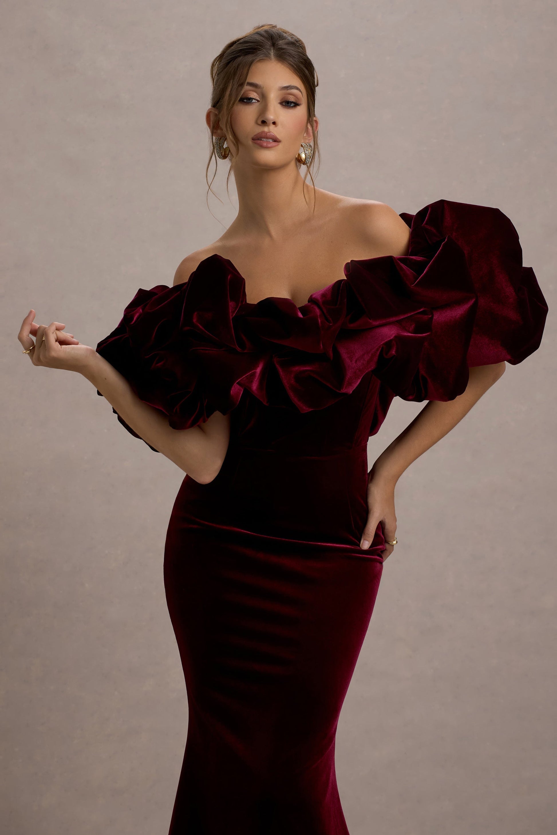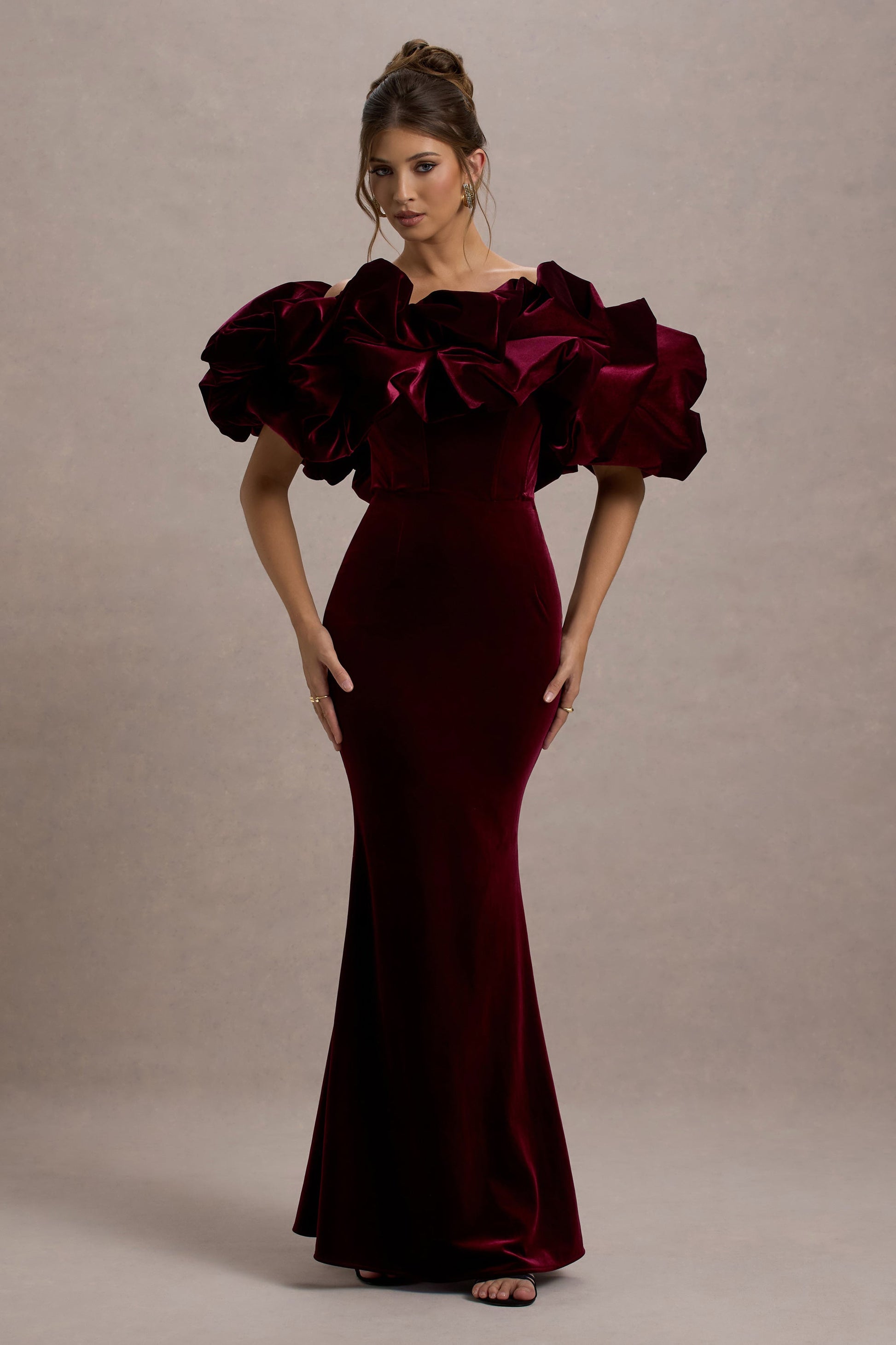 Cecily | Port Velvet Bardot Maxi Dress With Velvet Ruffle Trim
