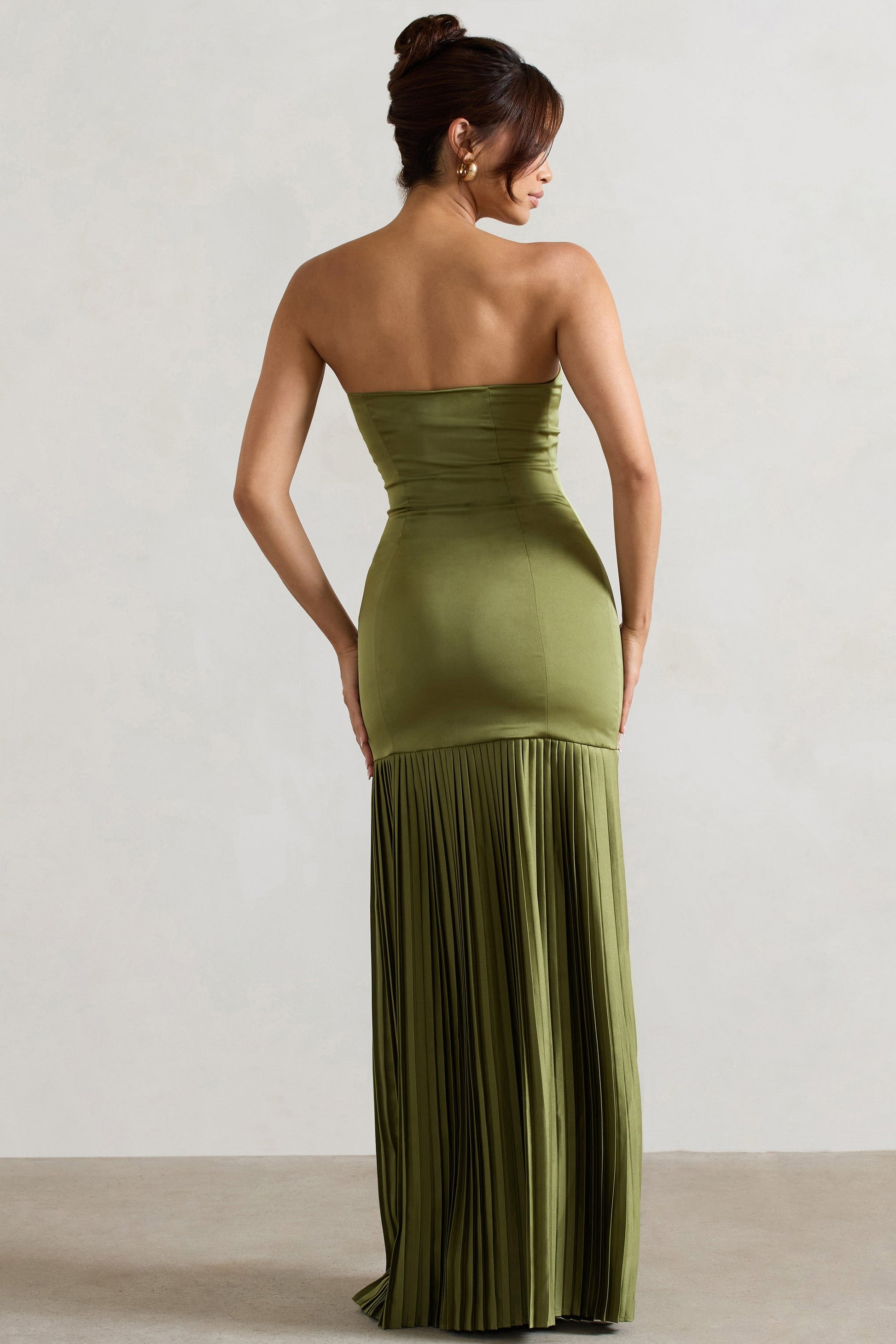 Confidence | Olive Satin Bandeau Pleated Split Maxi Dress