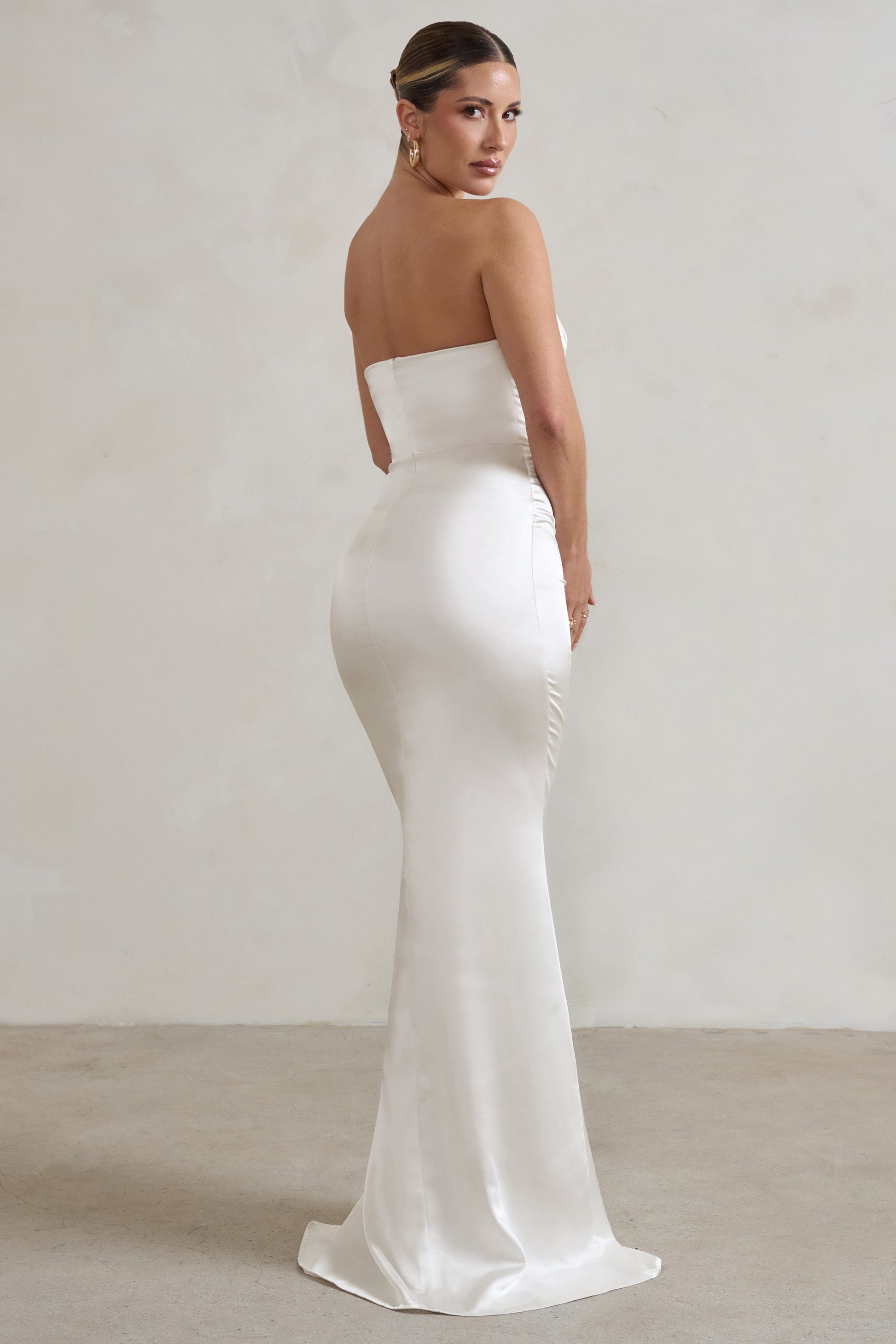 From birthday parties to grand engagements, whatever formal event you attend this season, make it one to remember in our stunning Coraline maxi dress. Premium weighted satin in pearlescent white shapes a strapless silhouette featuring a boned bodice and a long fluid skirt. This elegant dress is made all the more exquisite by a high split that showcases the left leg.