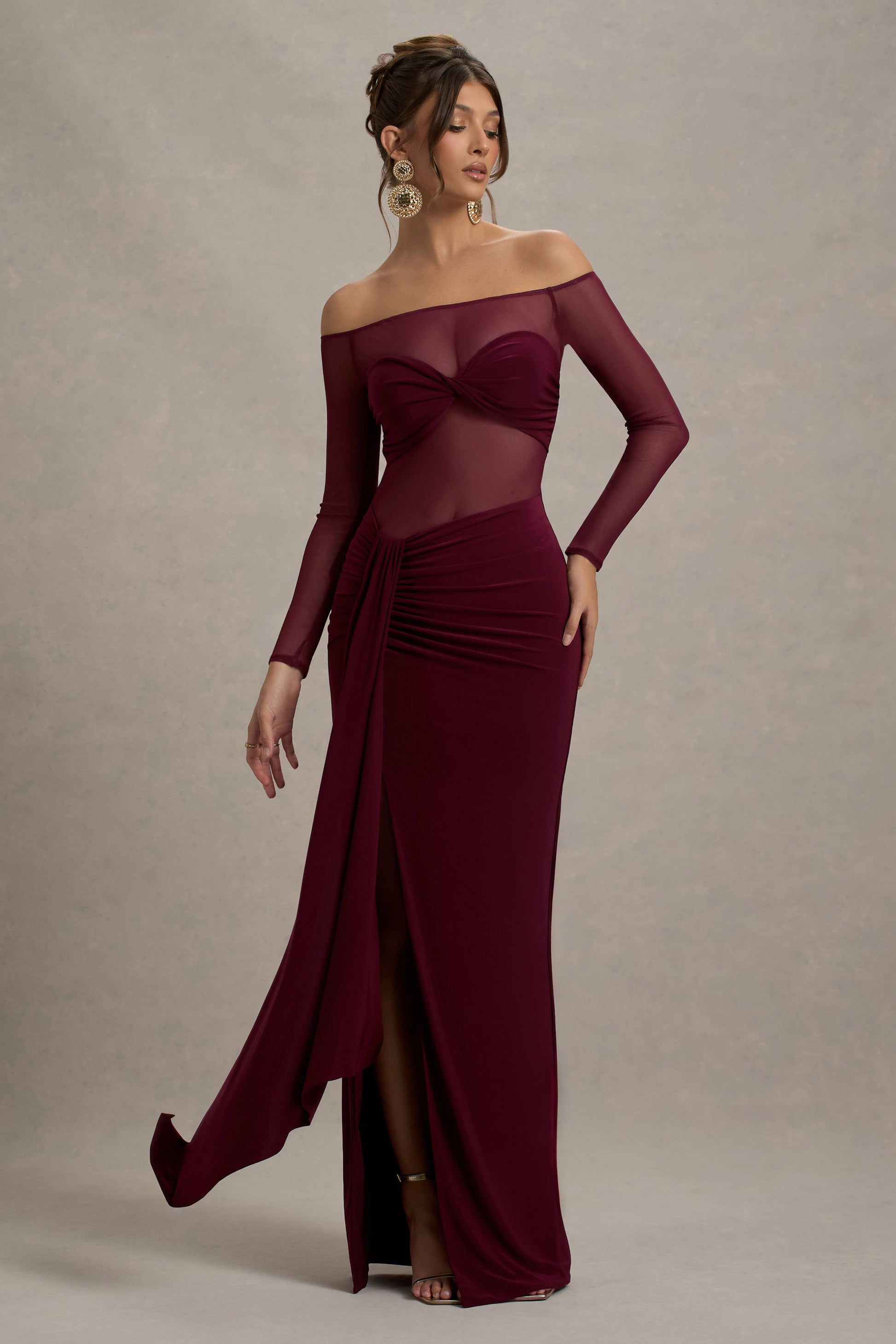 Cover Star | Burgundy Mesh Bardot Long-Sleeve Draped Maxi Dress