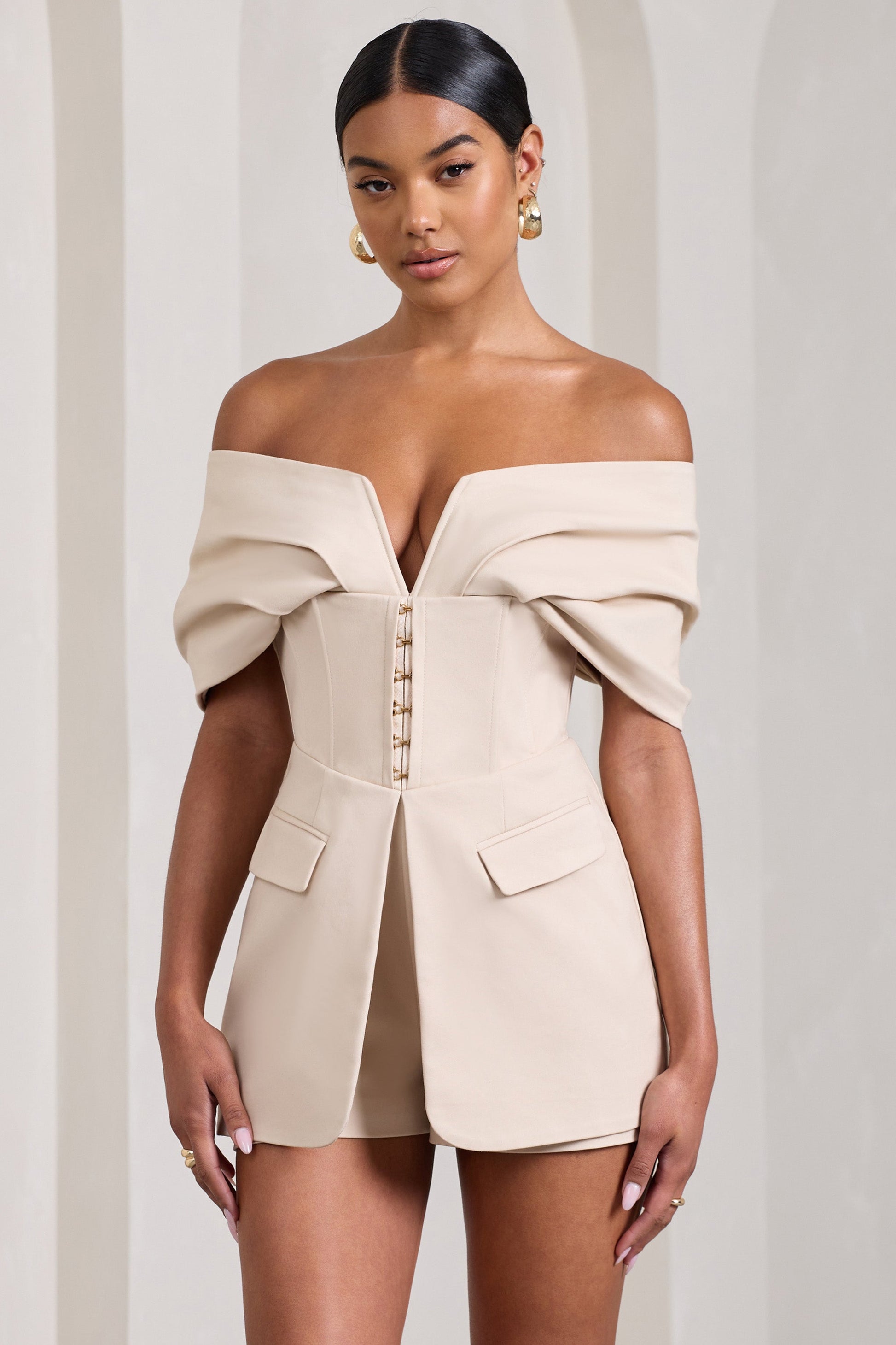 Soft and maiden-like with structured features, Damsel in the perfect playsuit for summer's outdoor occasions. This champagne playsuit is designed in a cotton-infused fabric to contour your silhouette comfortably. Shaped by a notched Bardot neckline, a hook-closed corset and small shorts, Damsel walks the fine line between classic and contemporary.