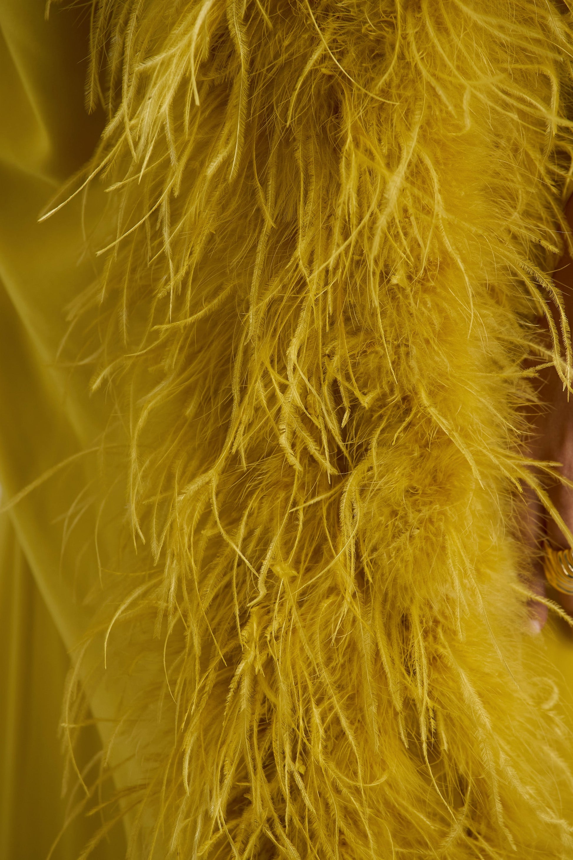 Destiny | Yellow Satin Asymmetric-Neck Midi Dress With Feather Details