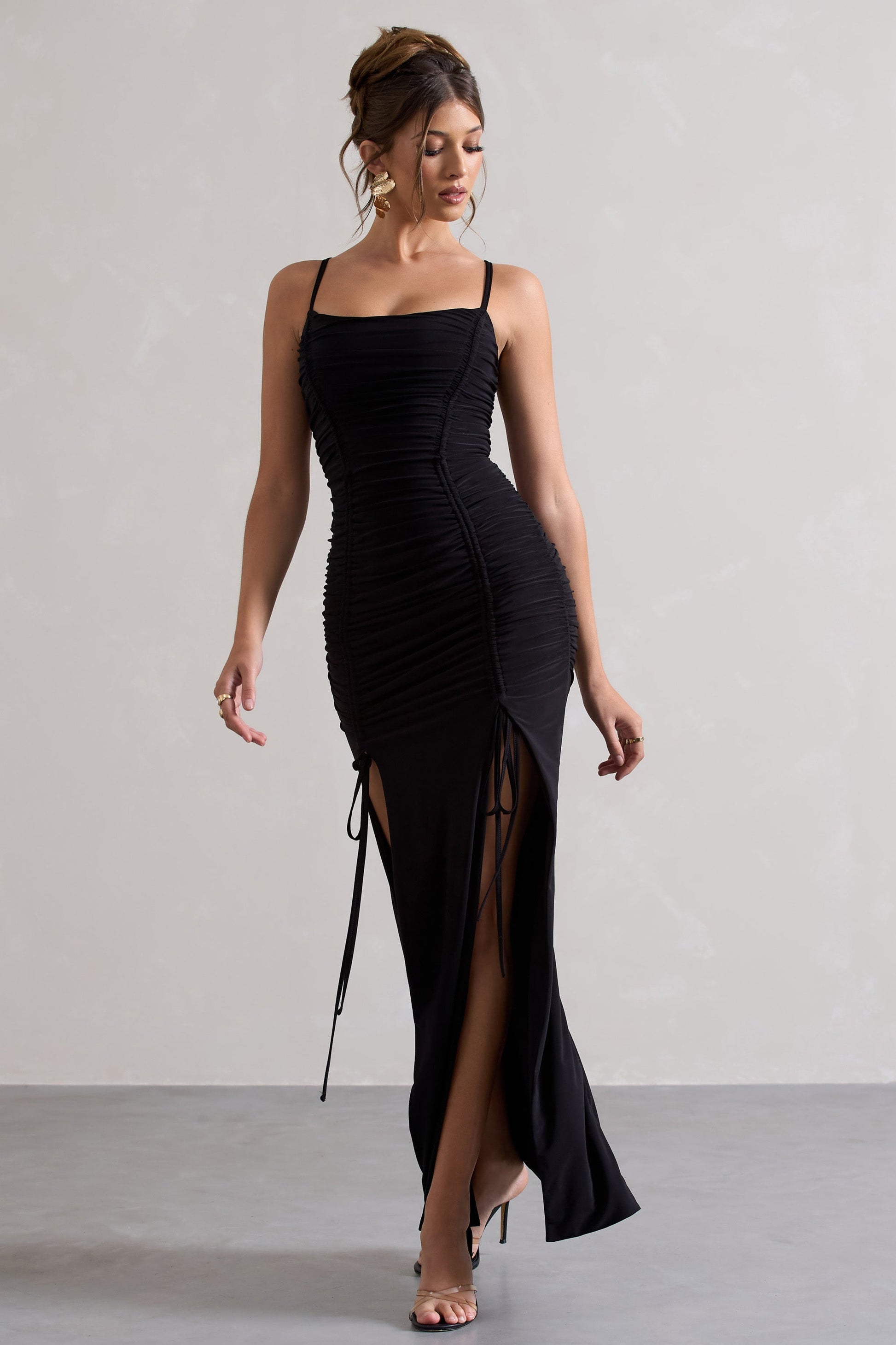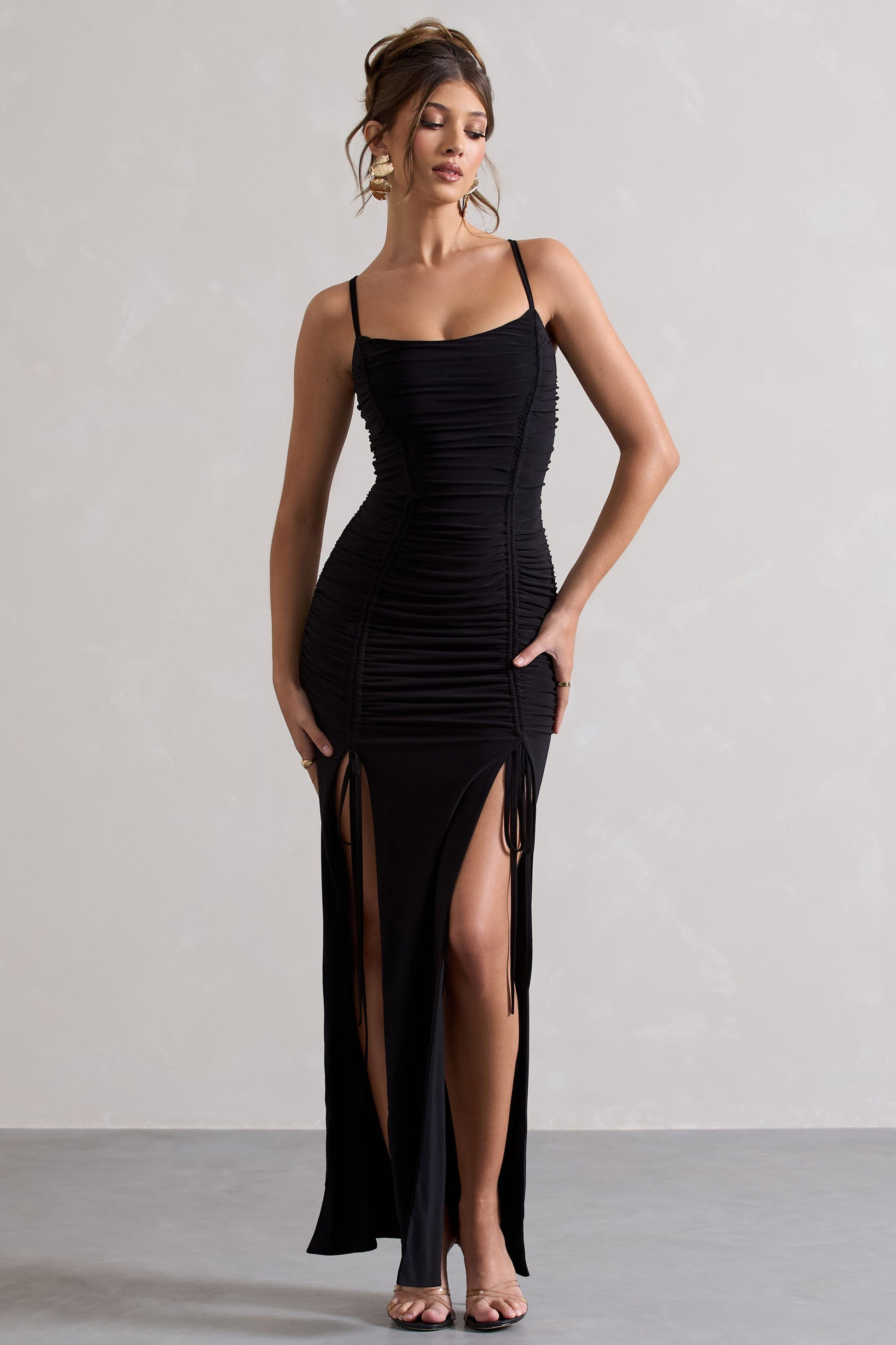 Devon | Black Ruched Strappy Maxi Dress With Splits