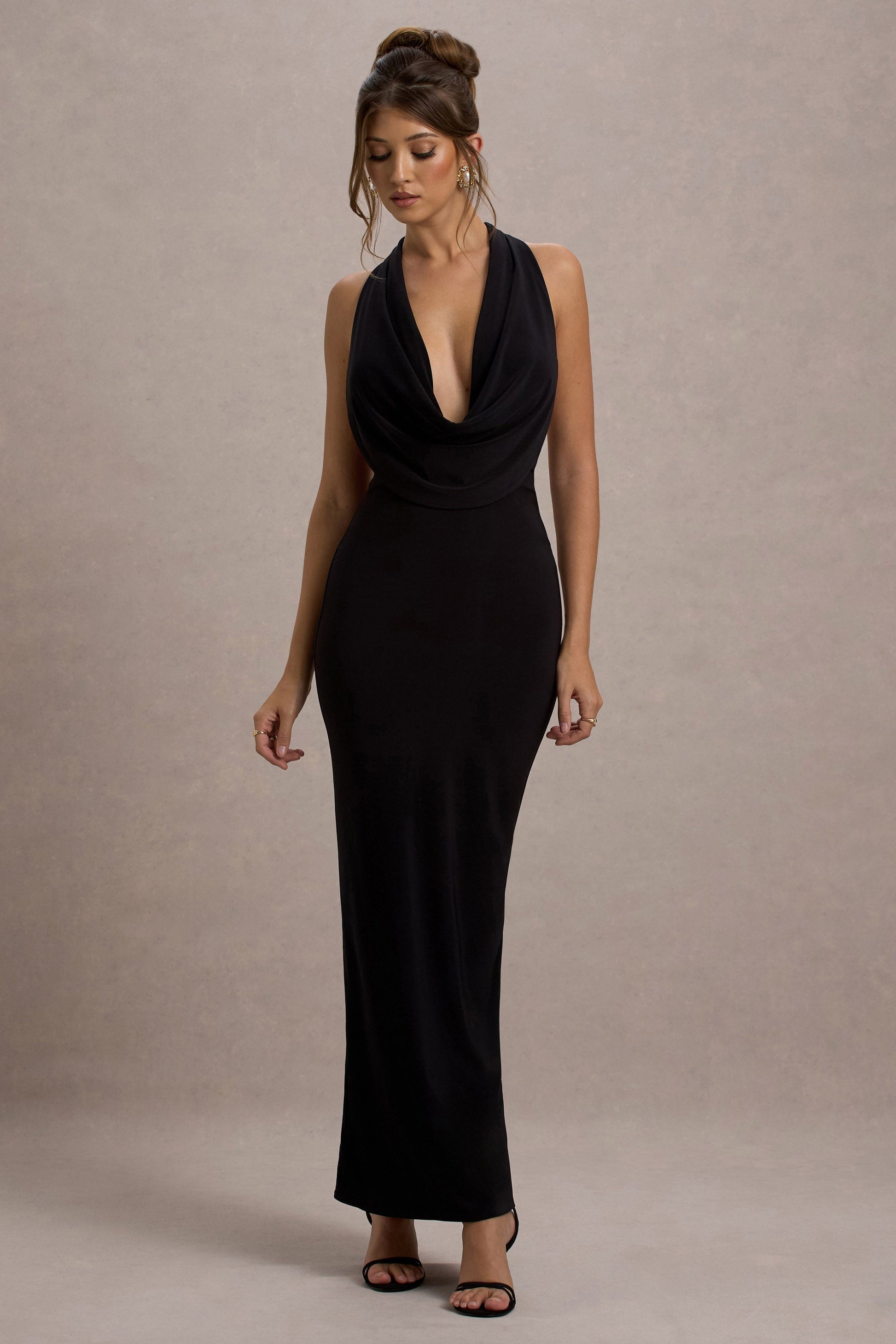 Simple yet seductive, turn heads in Edessa. Designed in a timeless black shade of our curve-enhancing jersey, this statement staple boasts a plunging cowl neckline, self-tie halter and sultry open back.