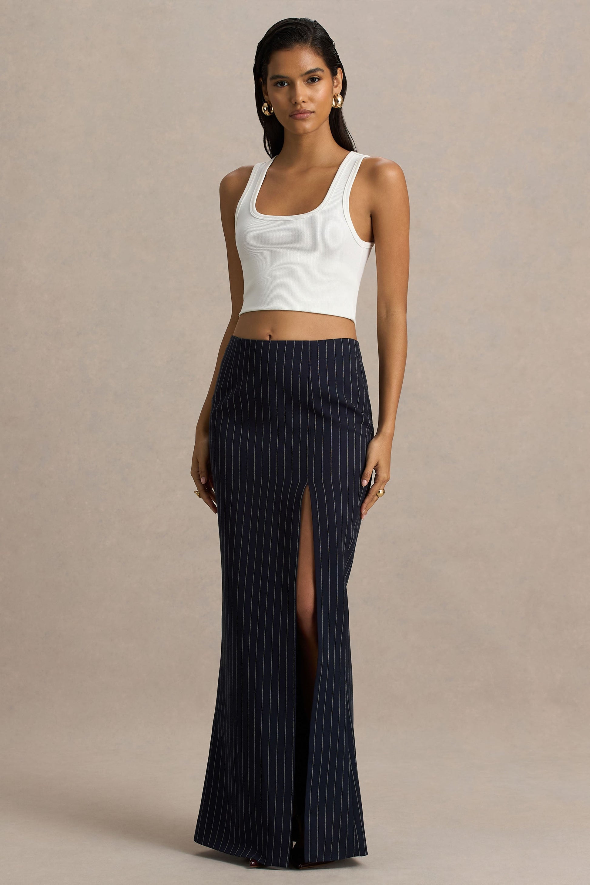 Elana | Navy Pinstripe Maxi Skirt With Front-High Split