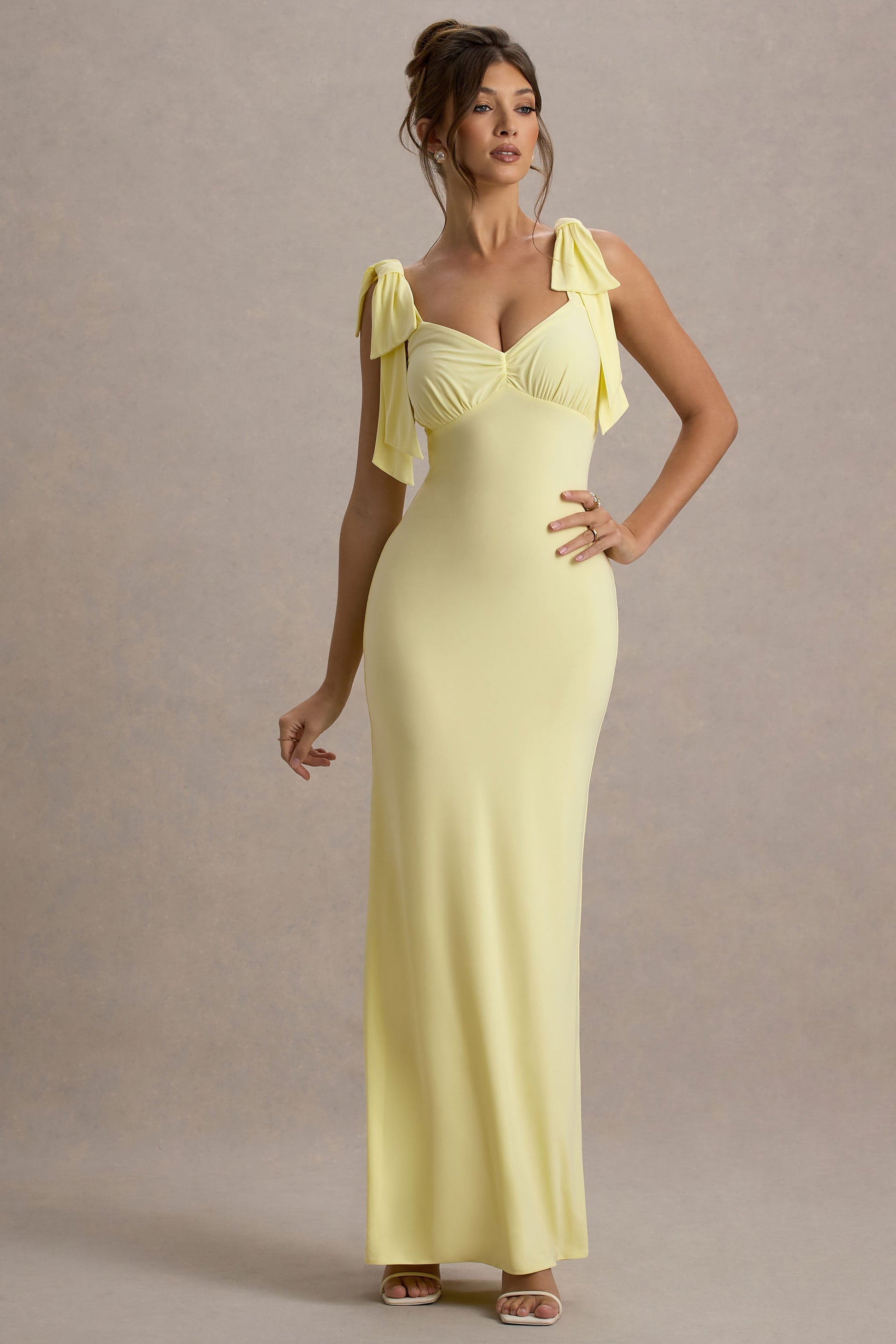 Get garden party ready in Evanna, our ethereal maxi dress. Arriving in a light lemon shade of our premium jersey, this lavish piece is defined by bow-inspired straps, a v neckline and floor-length skirt.
