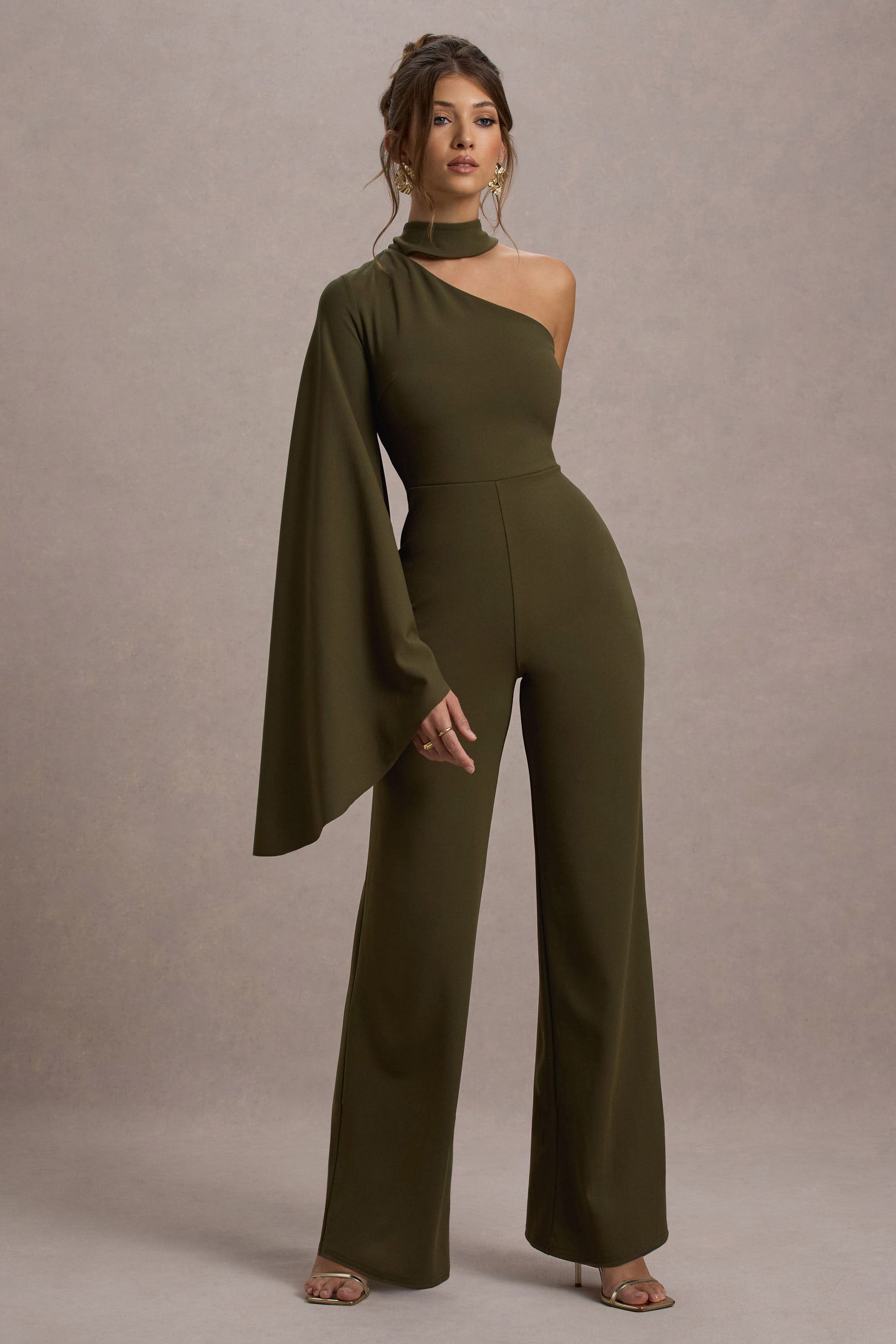 Fenix | Khaki Asymmetric Cape-Sleeve Straight-Leg Jumpsuit