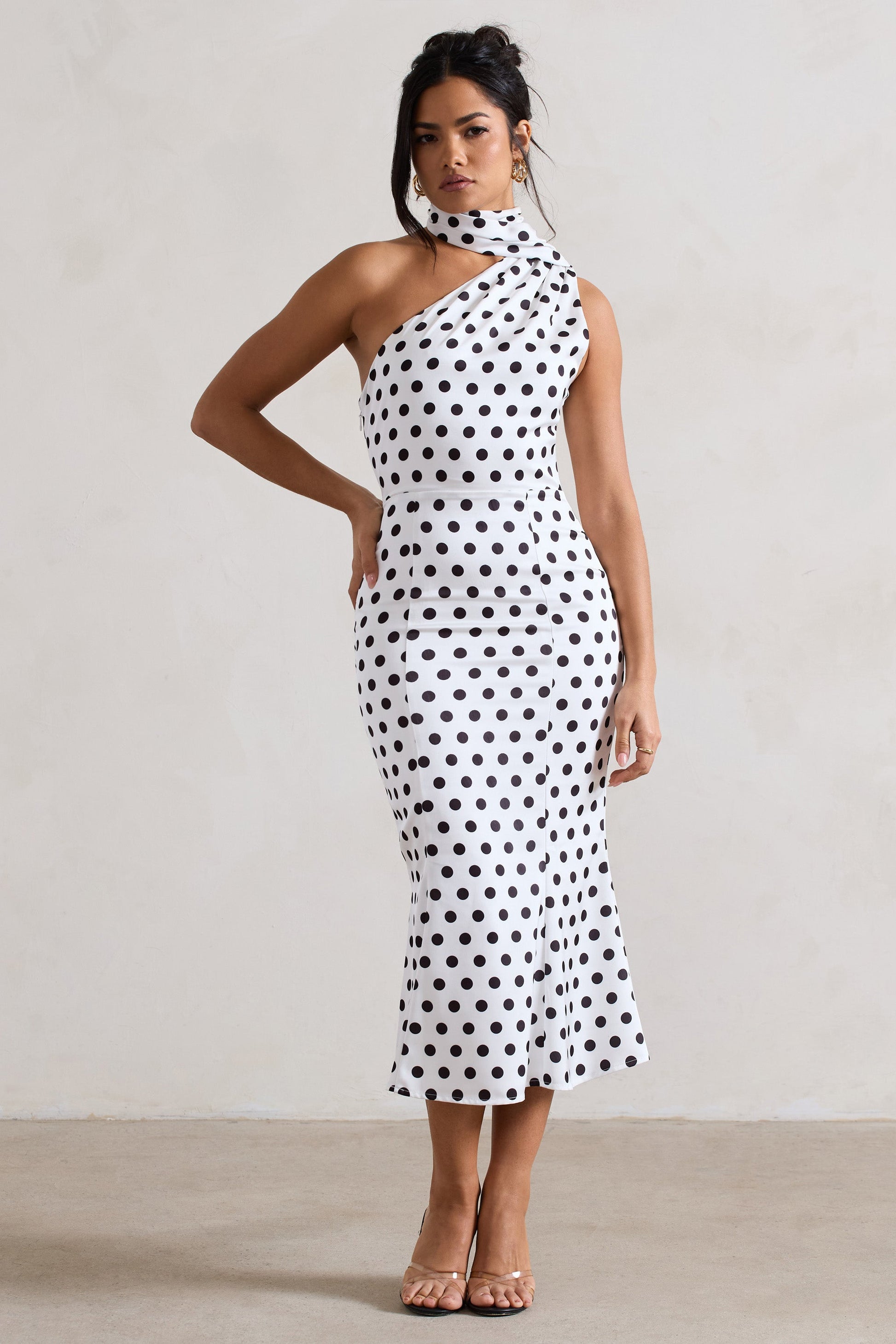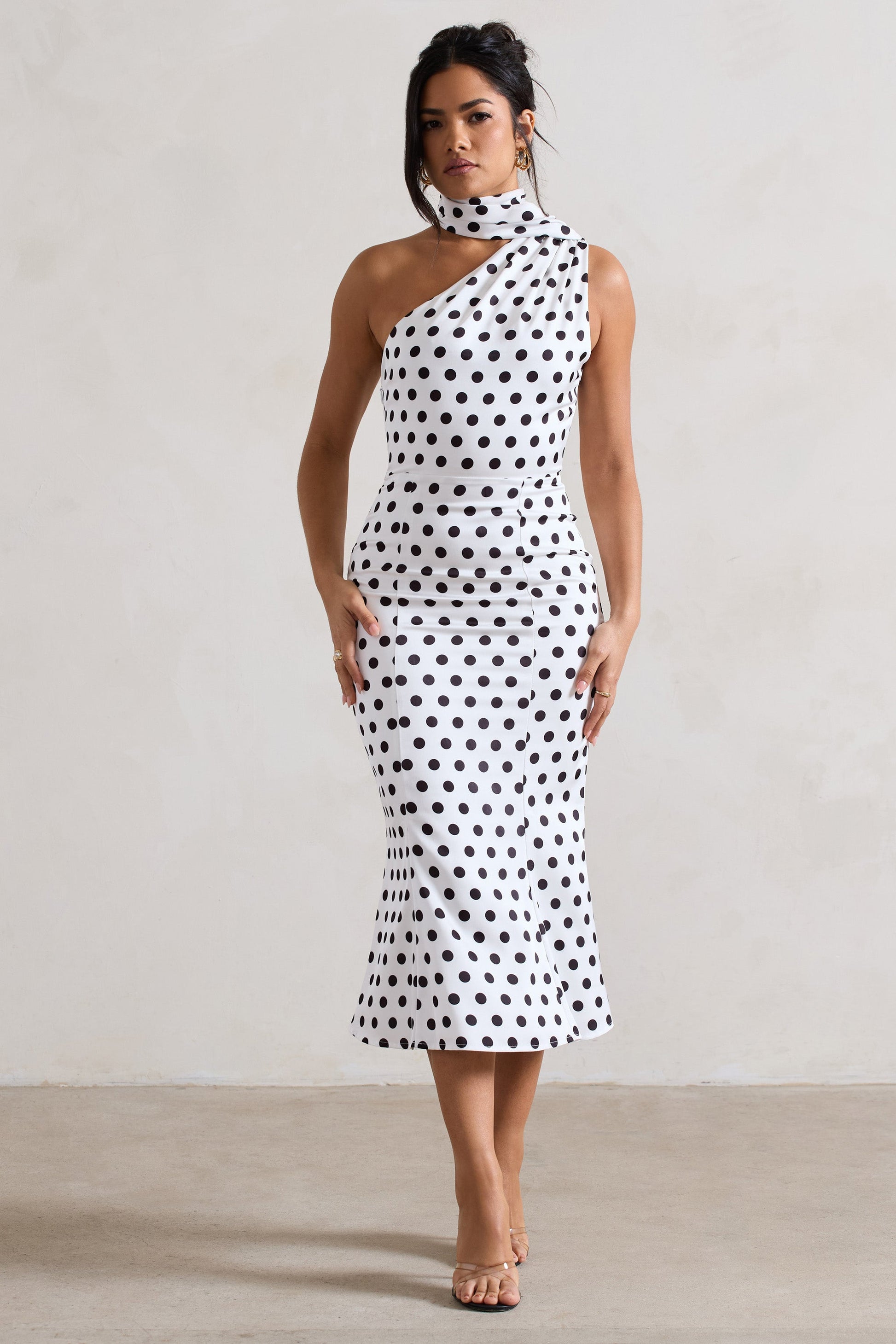 Golden Girl | White Polka Dot One Shoulder High-Neck Flared Midi Dress