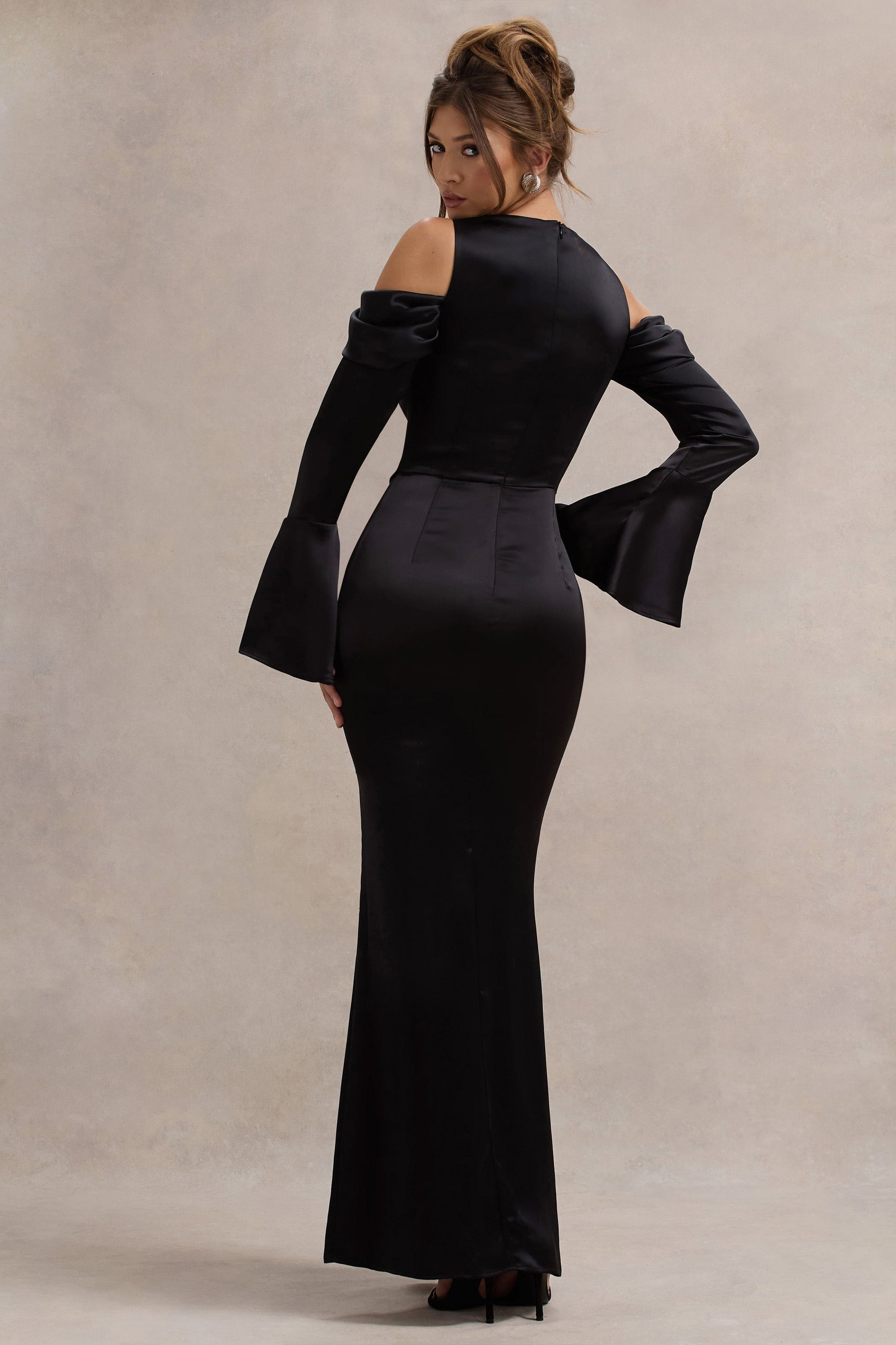 Heartthrob | Black Satin Draped Bardot Maxi Dress