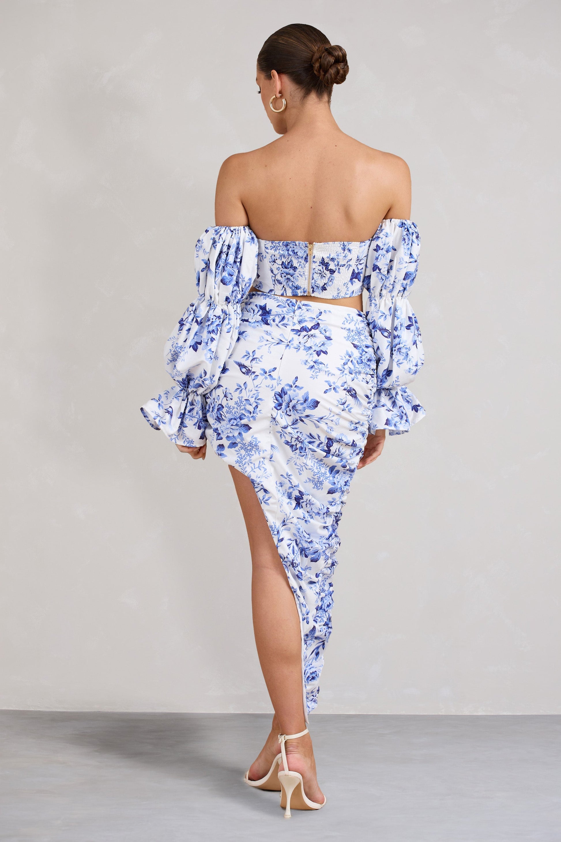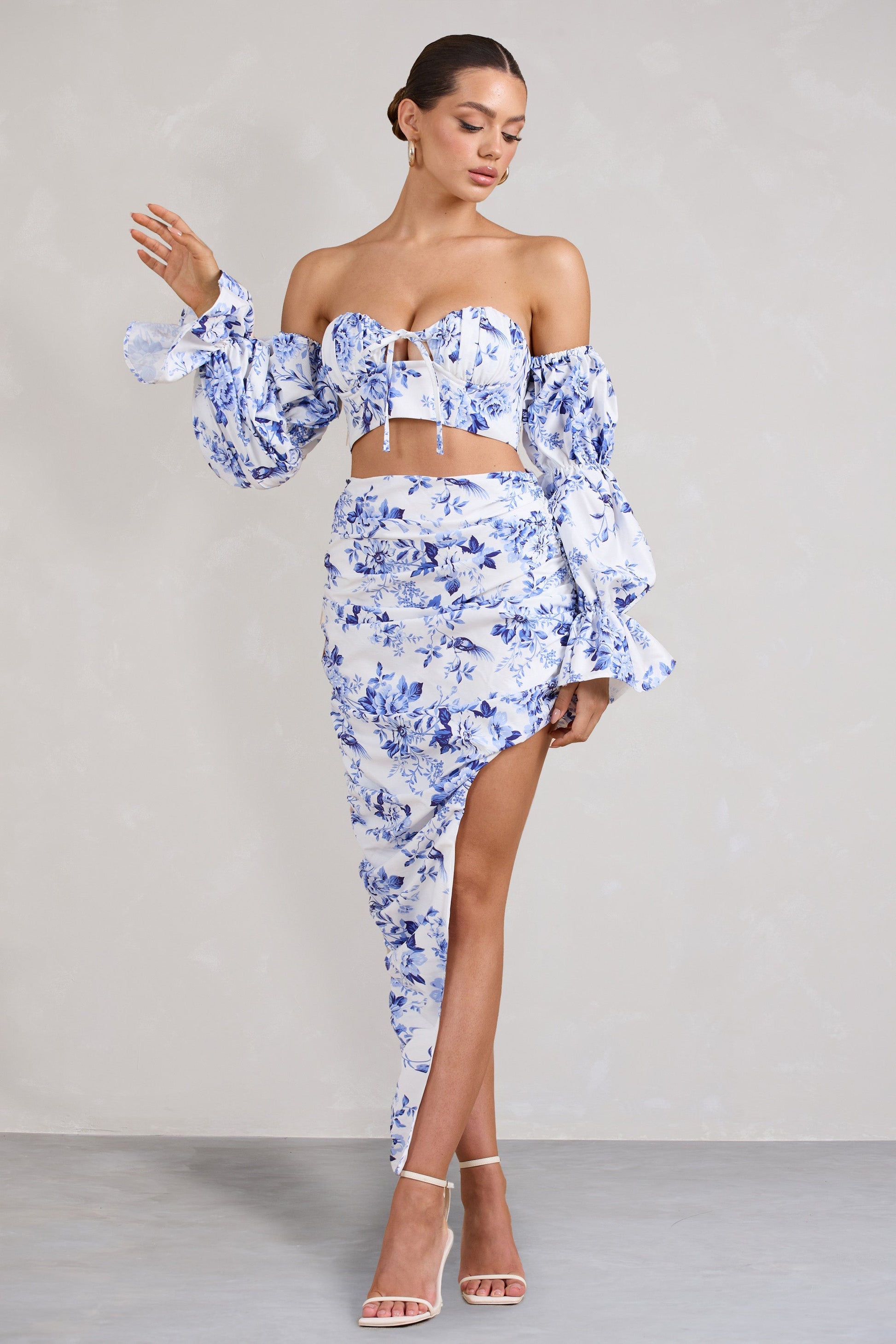 Holiday | Blue Floral Ruched Asymmetric Maxi Skirt
