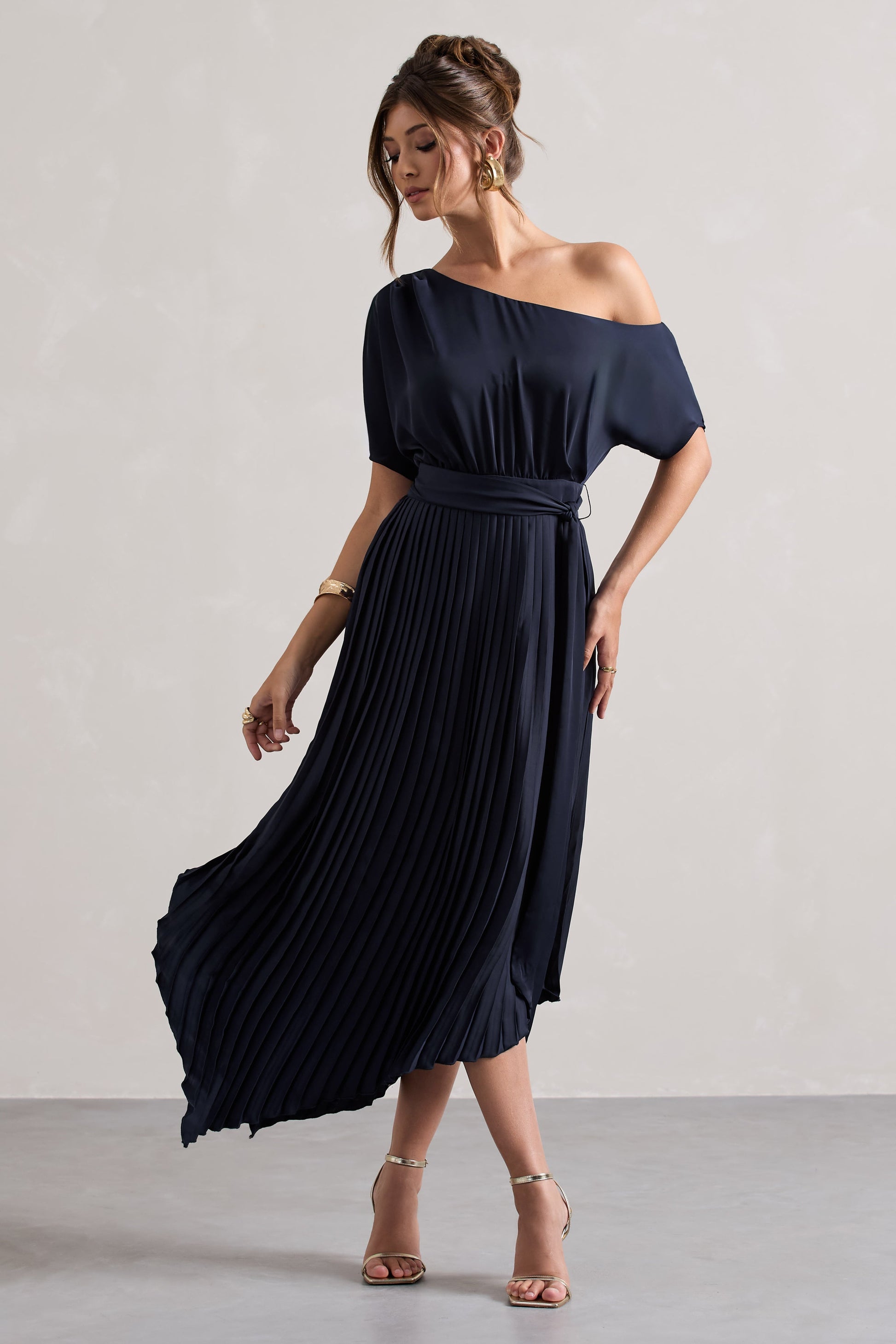 Artful asymmetry and playful pleating come together in India. Crafted in a deep navy shade of a premium flowing satin, this midi dress features an asymmetric neckline and hem. India is detailed with a pleated plisse skirt and self-tie satin belt.