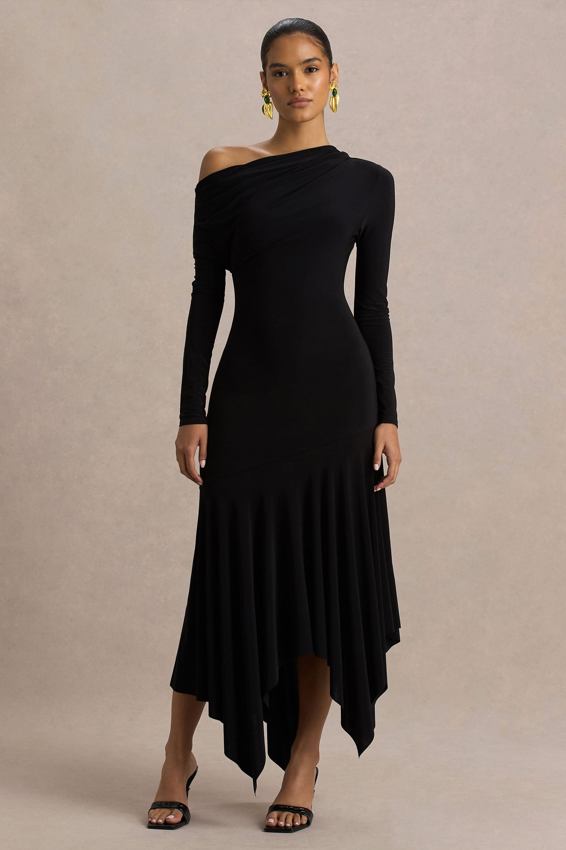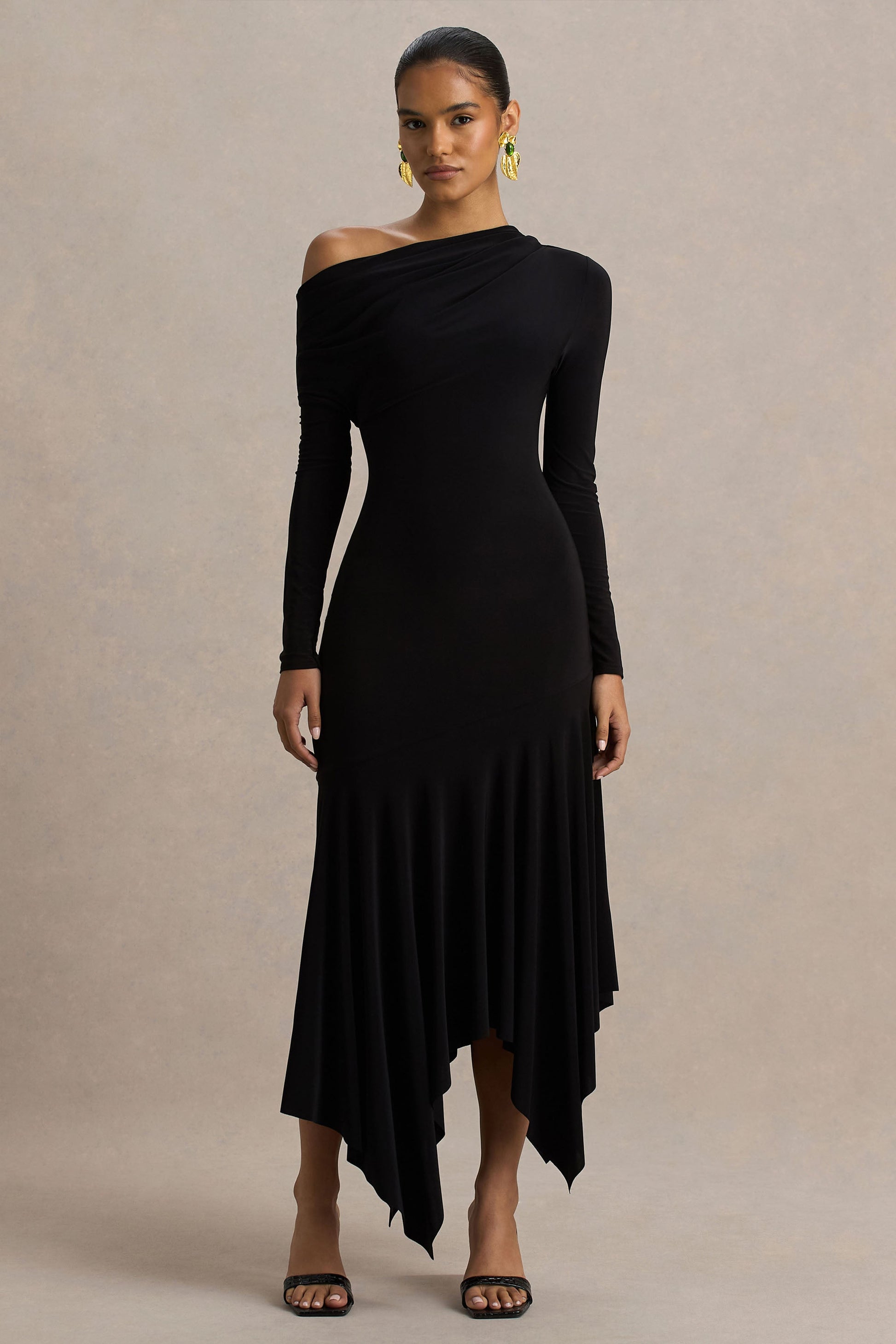 Isola | Black Asymmetric-Neck Midi Dress With Drop-Waist