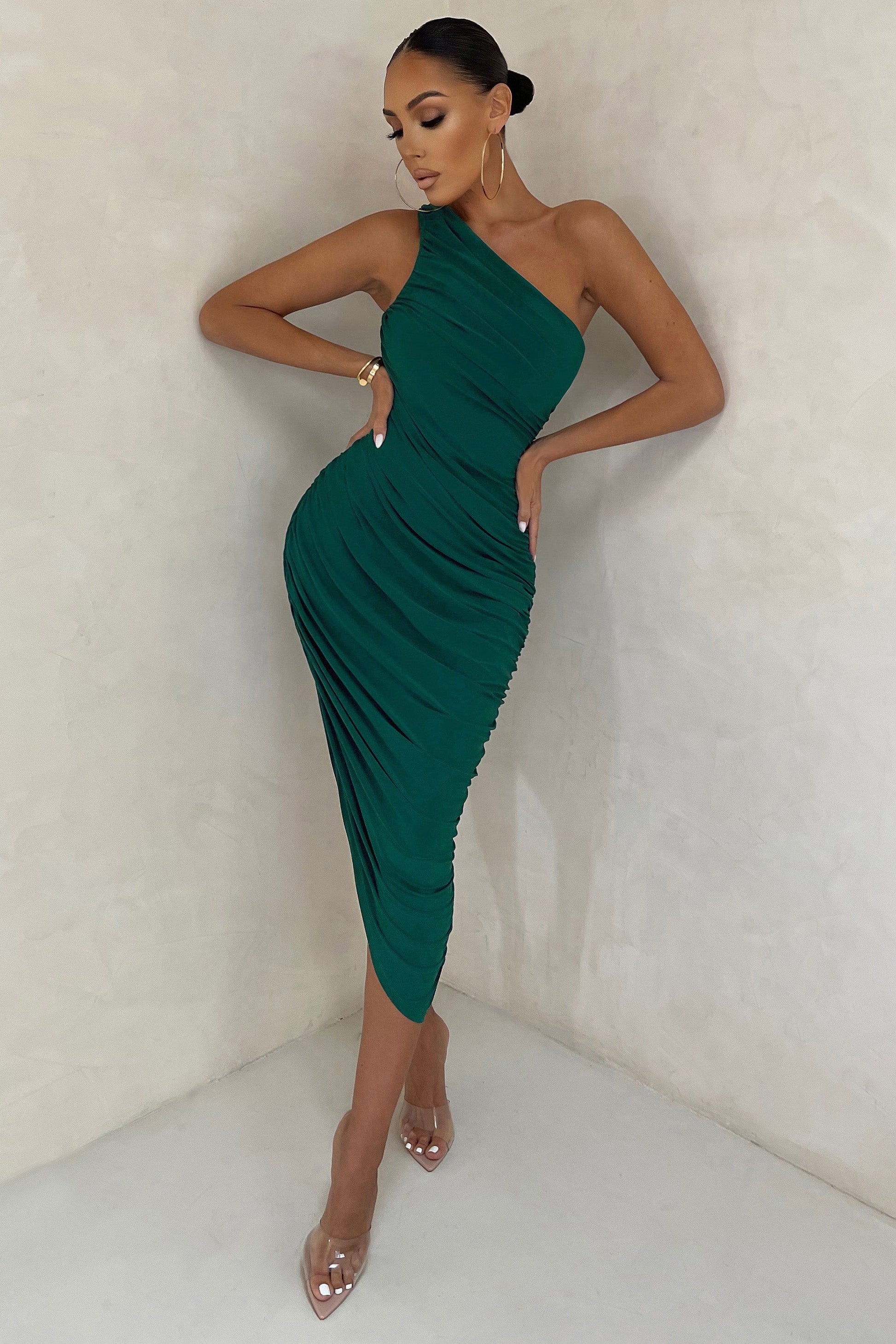 Late Night | Bottle Green Asymmetric One Shoulder Ruched Midi Dress