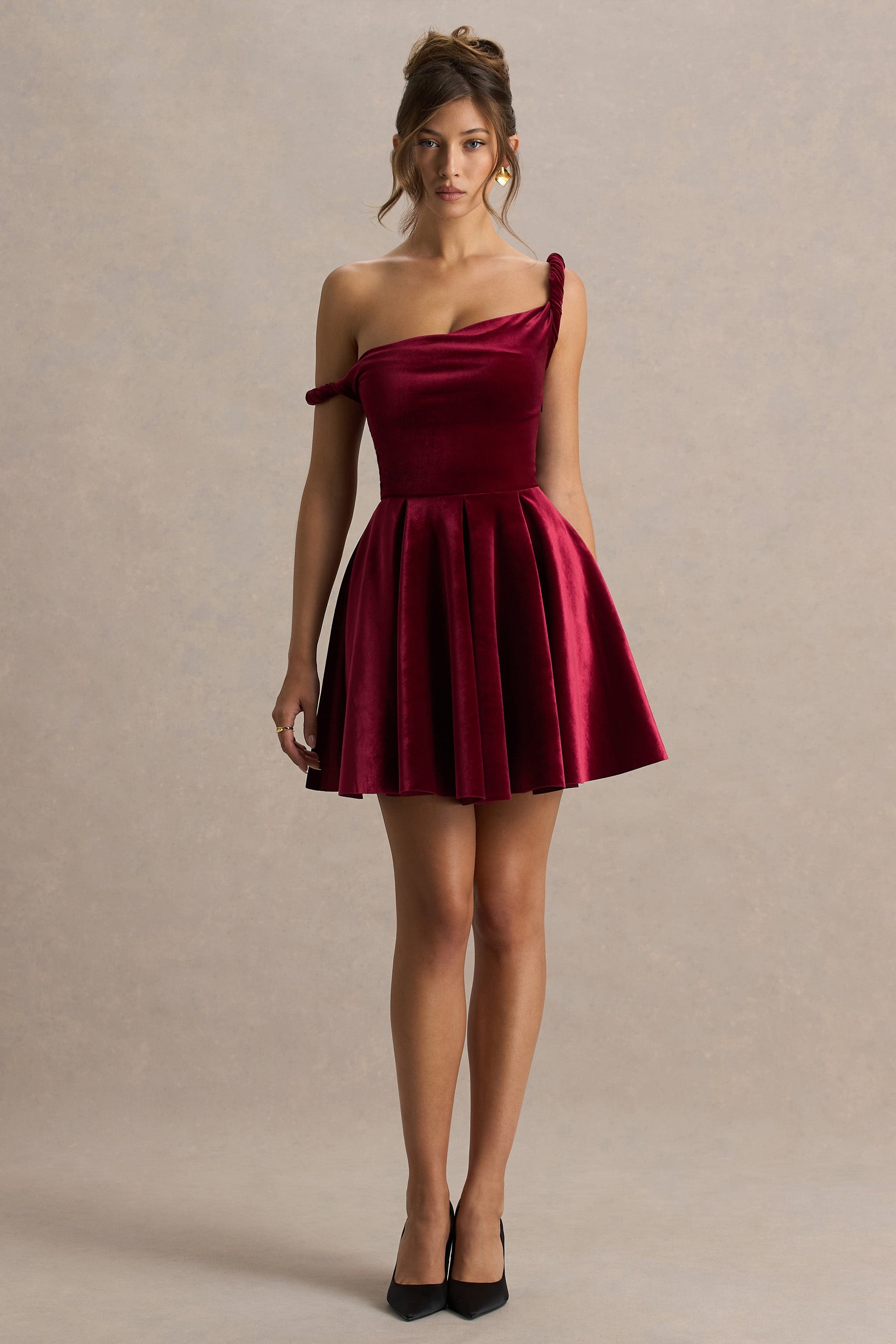 Leticia | Burgundy Velvet Asymmetric-Neck Velvet Mini Dress With Twist-Sleeve