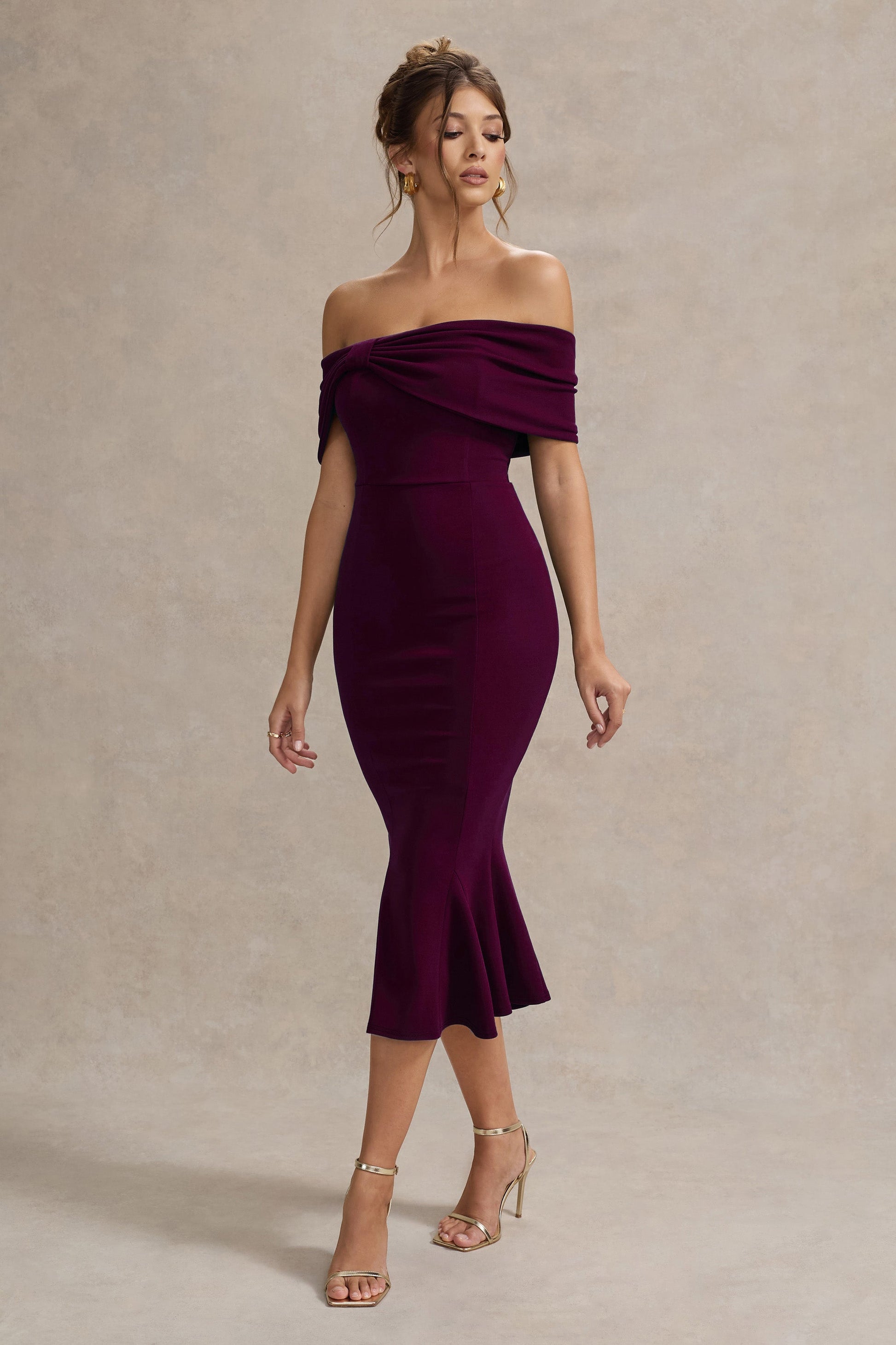 Lydia | Plum Bardot Bow Detail Midi Dress