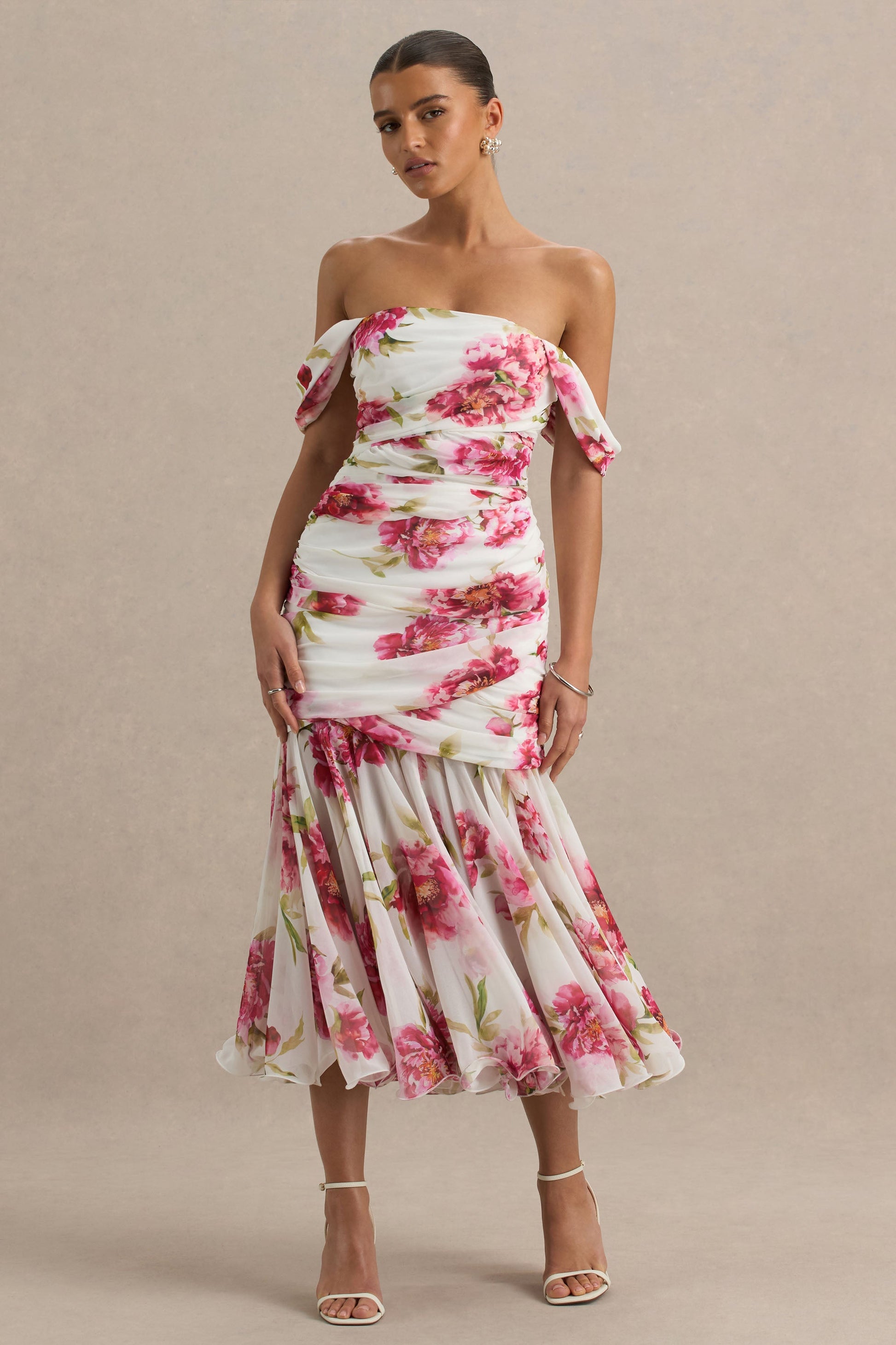 Madelyn | Cream Floral Print Short-Sleeve Bardot Wrap Maxi Dress With Ruching
