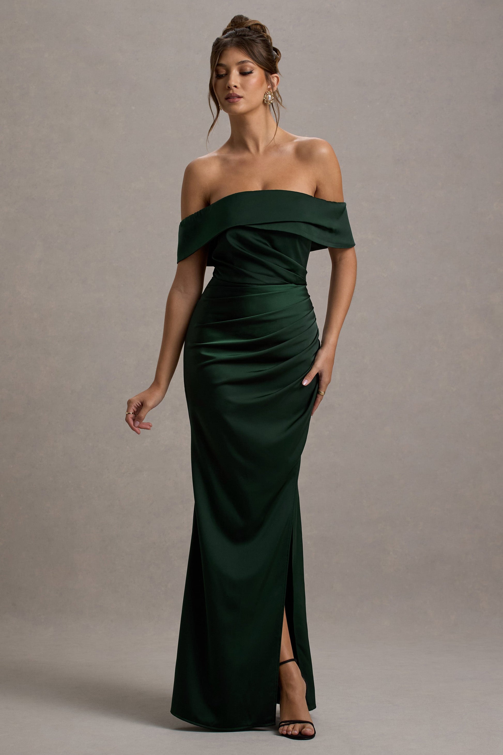 Defined by graceful details that bring undeniable elegance, Martine is a sophisticated choice for your next special occasion. Crafted from our luxurious bottle green stretch satin, this bardot wrap maxi dress drapes effortlessly off the shoulders, accentuating the neckline and framing your collarbone with a hint of allure. Designed with a figure-flattering wrap silhouette, Martine flows into a fluid, floor-length skirt that exudes timeless glamour.
