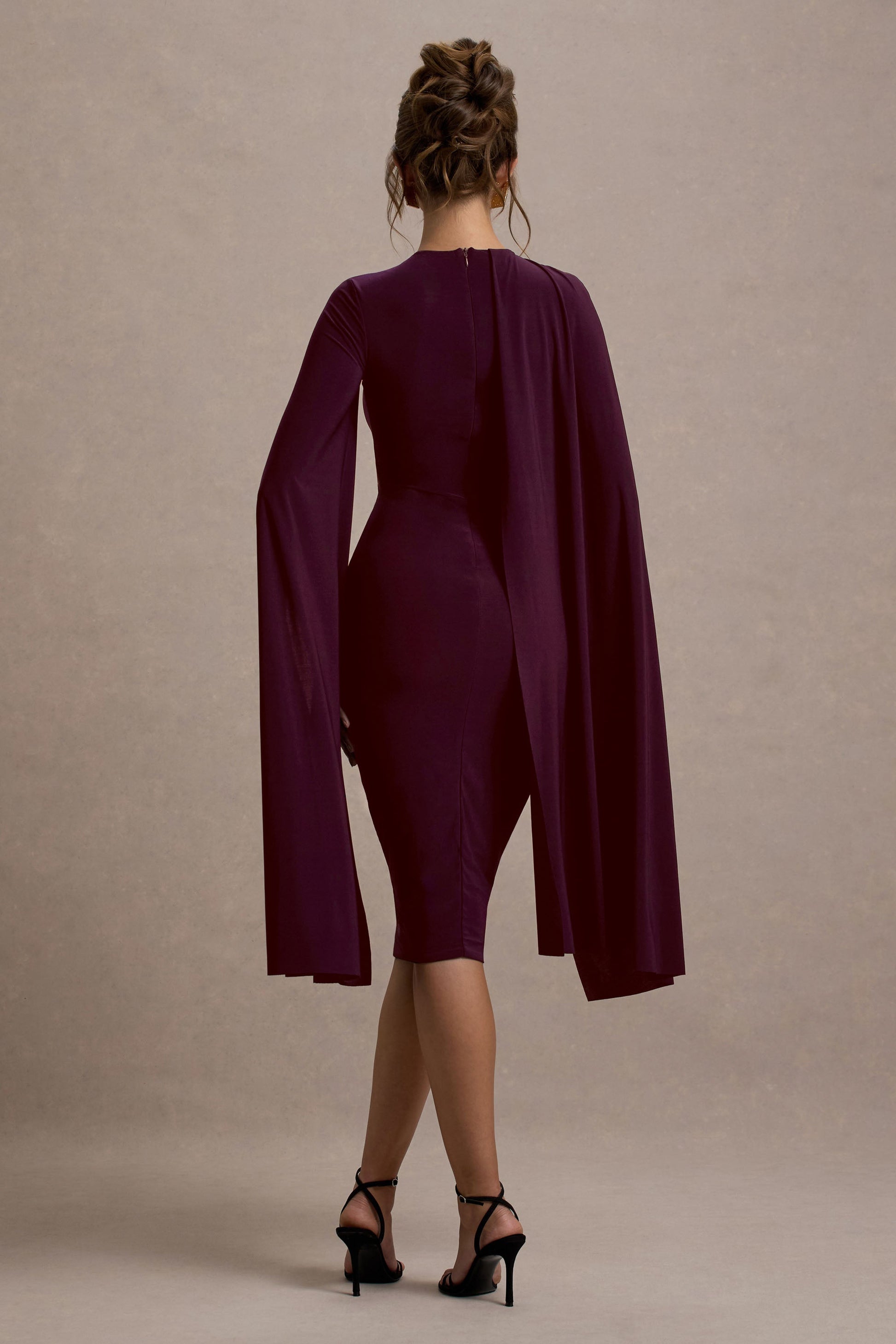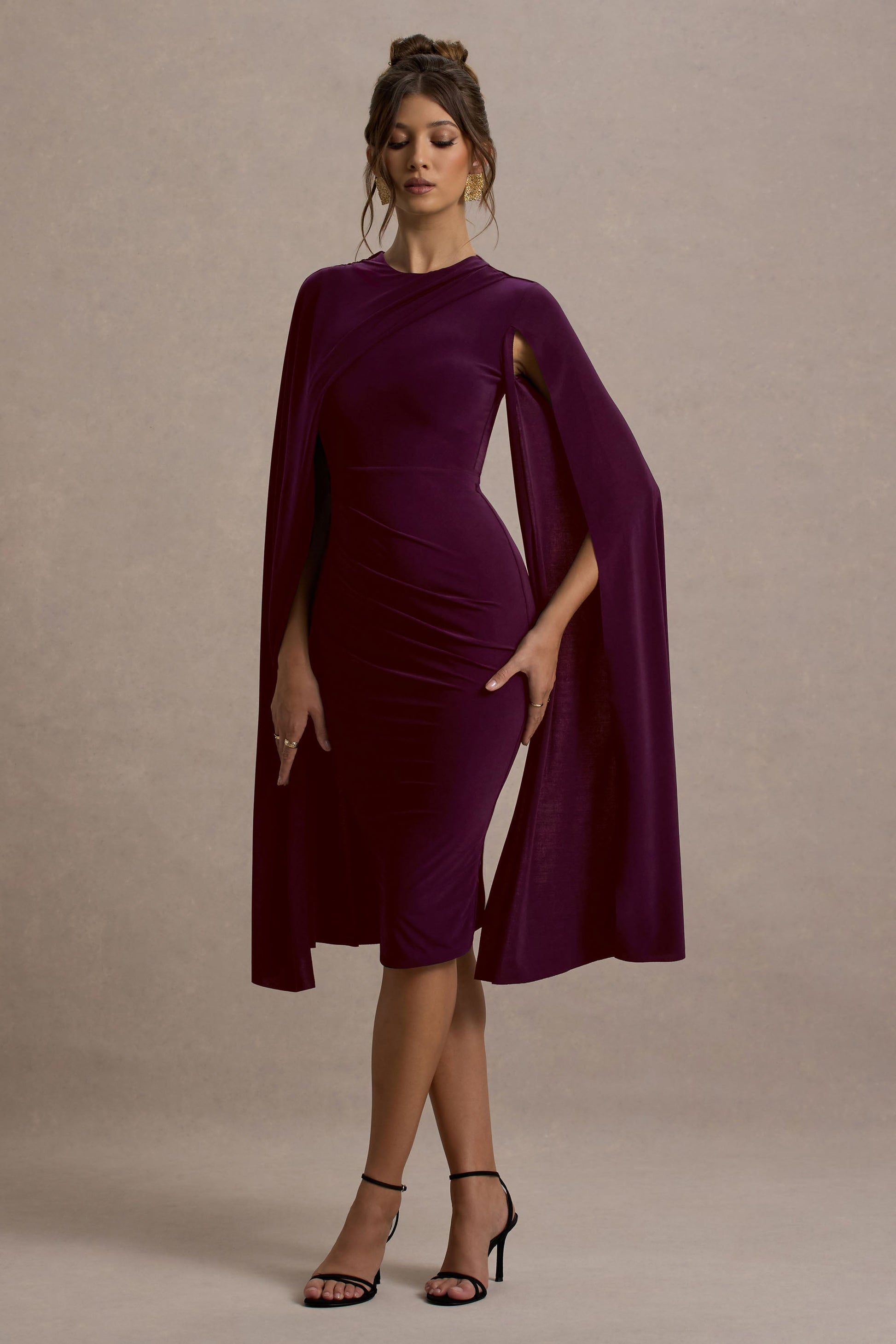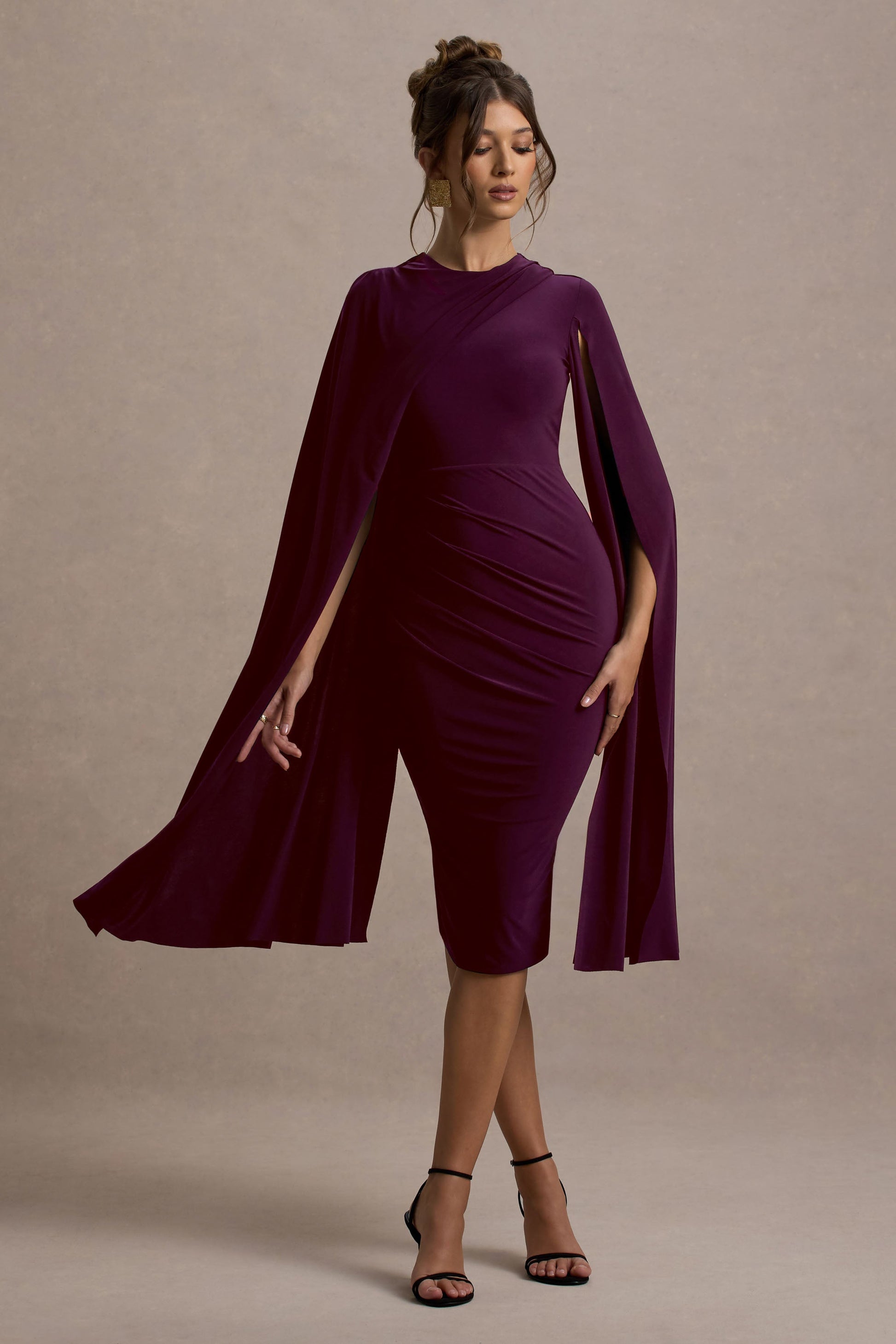 Add some impact to your occasion wardrobe with our unforgettable plum midi dress. Designed to show off your silhouette, this dress has a bodycon fit and is double lined to flatter and enhance. The crew neckline is balanced with a below the knee hemline, while the cape sleeves deliver a high impact yet sophisticated look. Perfect for a christening or for a modern wedding guest look, Marysol is the one!
