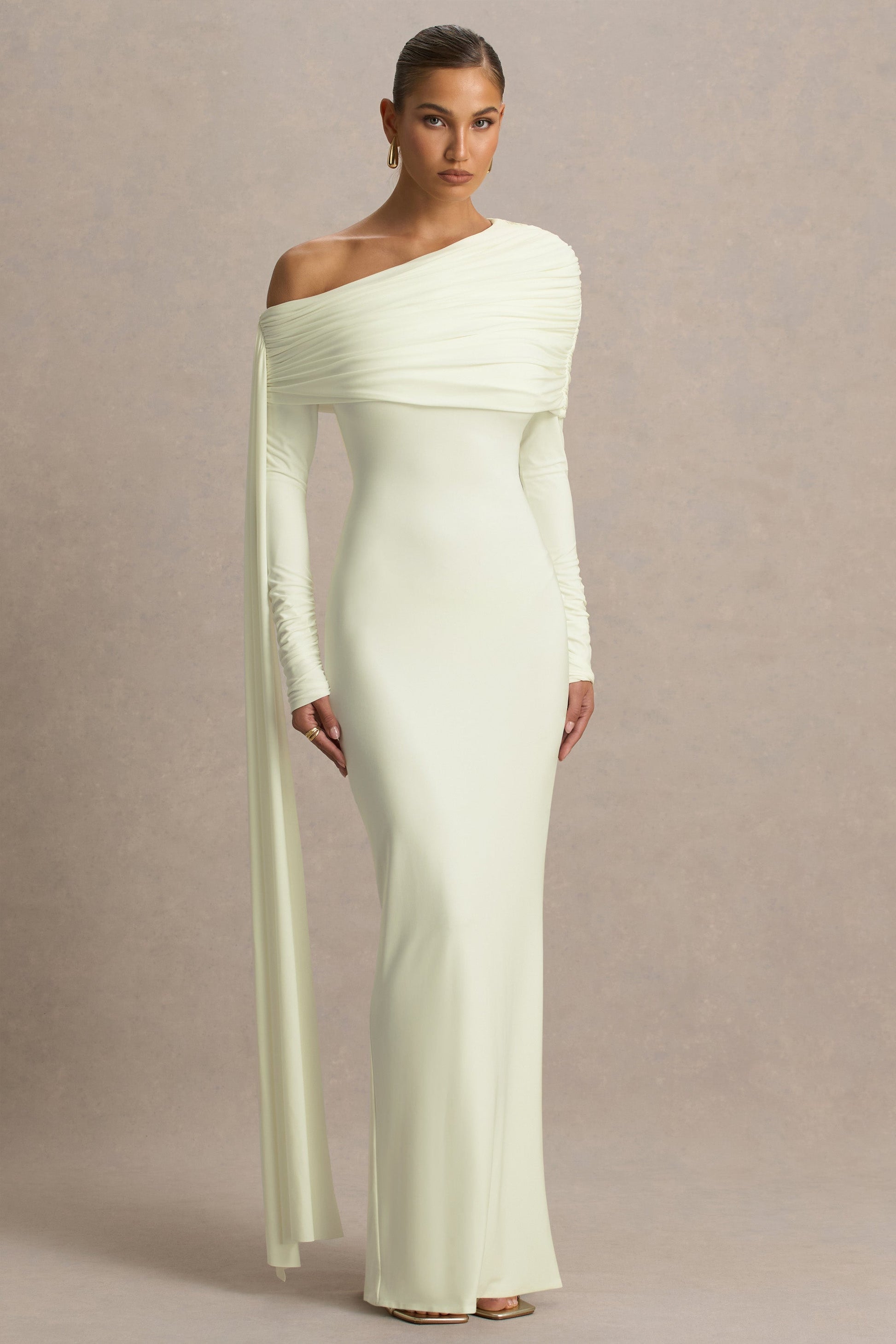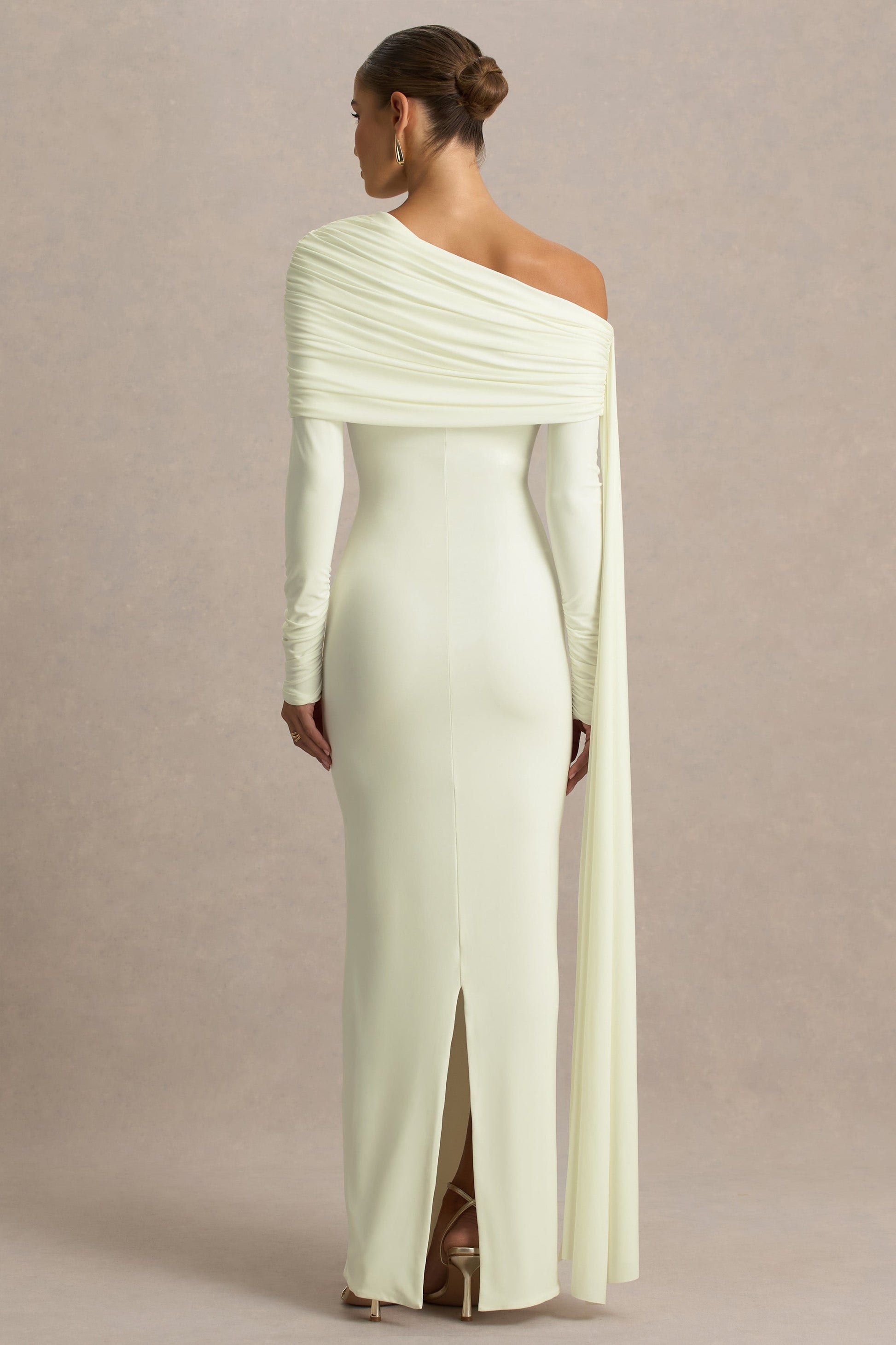 Graceful, glamorous, and undeniably captivating, Octavia is made for the spotlight. Cut from our premium stretch jersey in a soft cream hue, this maxi dress this gown is an embodiment of elevated eveningwear. A romantic bardot neckline highlights the decolletage, balanced by long sleeves for a sleek silhouette. Finished with ruched detailing sculpts the body, while a fluid sash falls from the waist, adding elegant movement with every step. From black tie affairs to elegant dinner parties, in Octavia you will turn heads.
