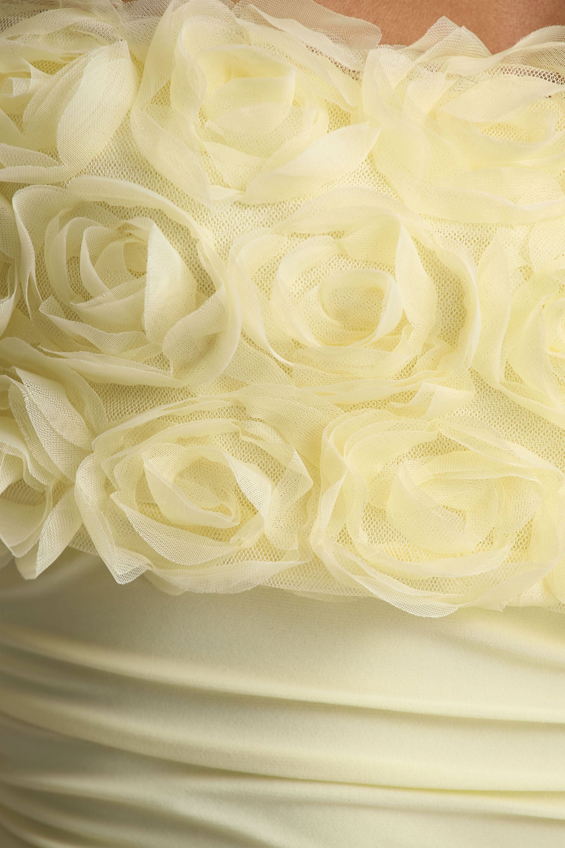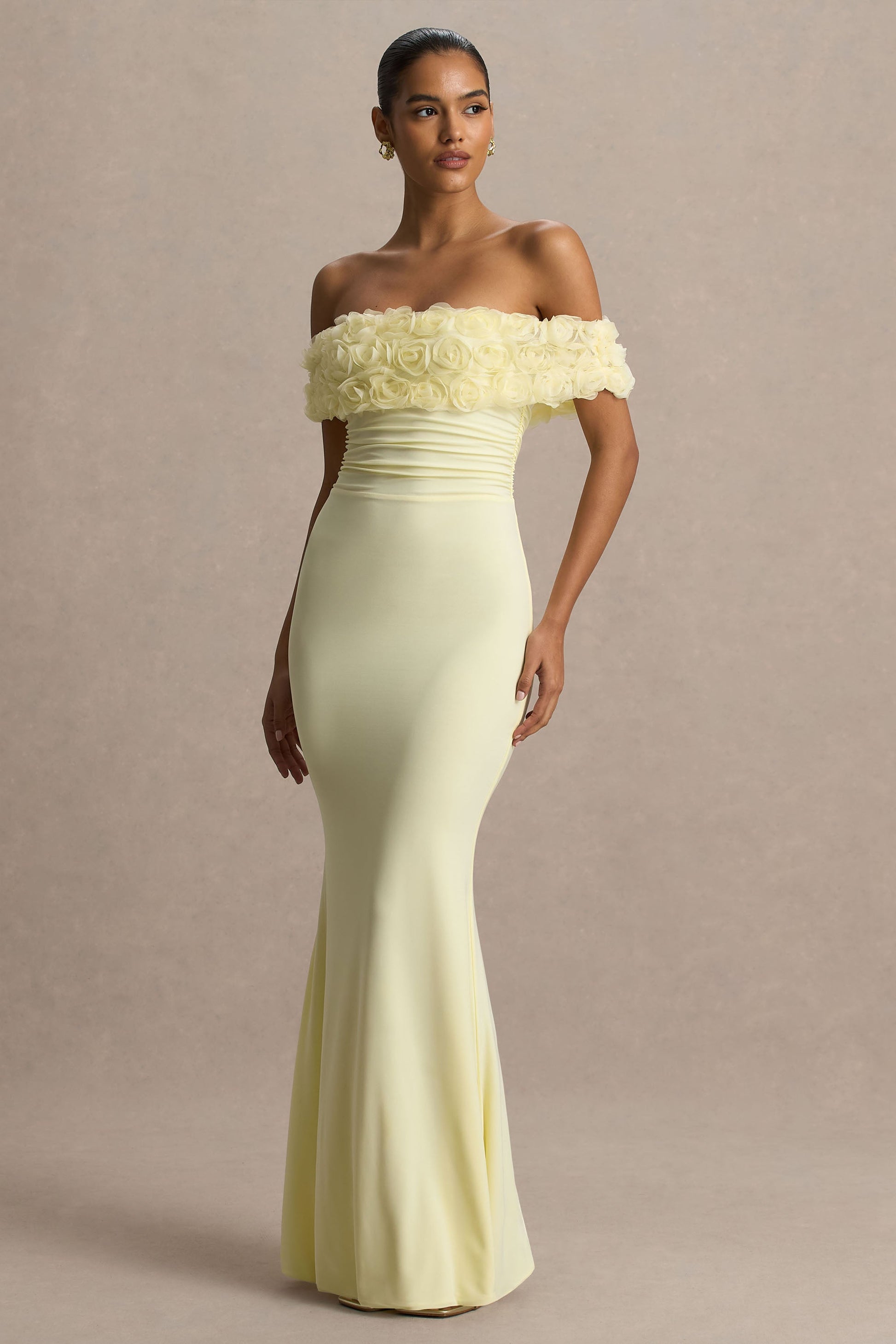 Say hello to Pastille, a chic and feminine must have for your occasion-wear wardrobe. Cut from our premium stretch jersey in a delicate lemon hue, this maxi dress seamlessly blends romantic detailing with sleek sophistication. The statement floral bardot neckline beautifully frames the shoulders, while ruched detailing across the bodice sculpts and defines your curves. Pastille is your go-to for weddings or any moment that calls for standout elegance, paired with a glamorous up-do and sleek heels.