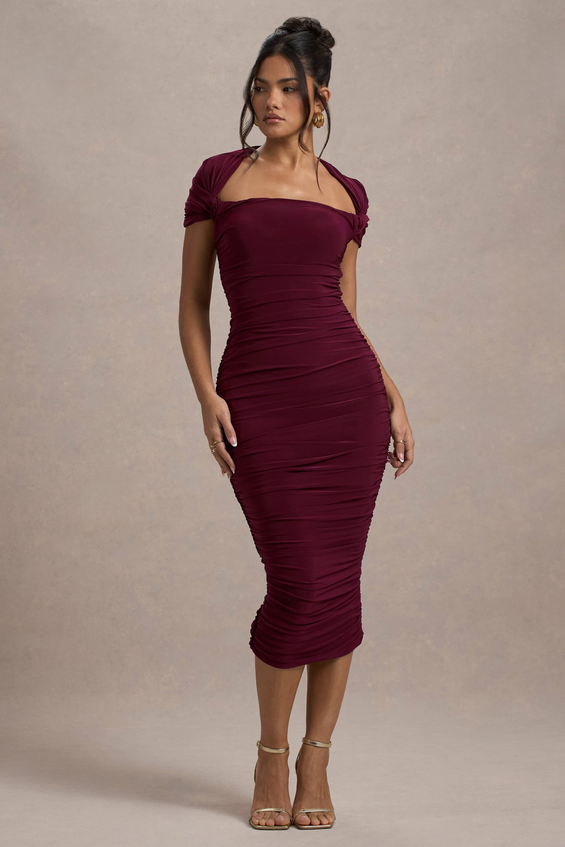 Every wardrobe needs a ruched midi dress and Paxos is the perfect choice. Expertly cut in an burgundy shade of our signature stretch jersey, with ruching to sculpt your figure. Paxos is detailed with short twisted sleeves and would look stunning styled with a tousled bun and some gold accents.