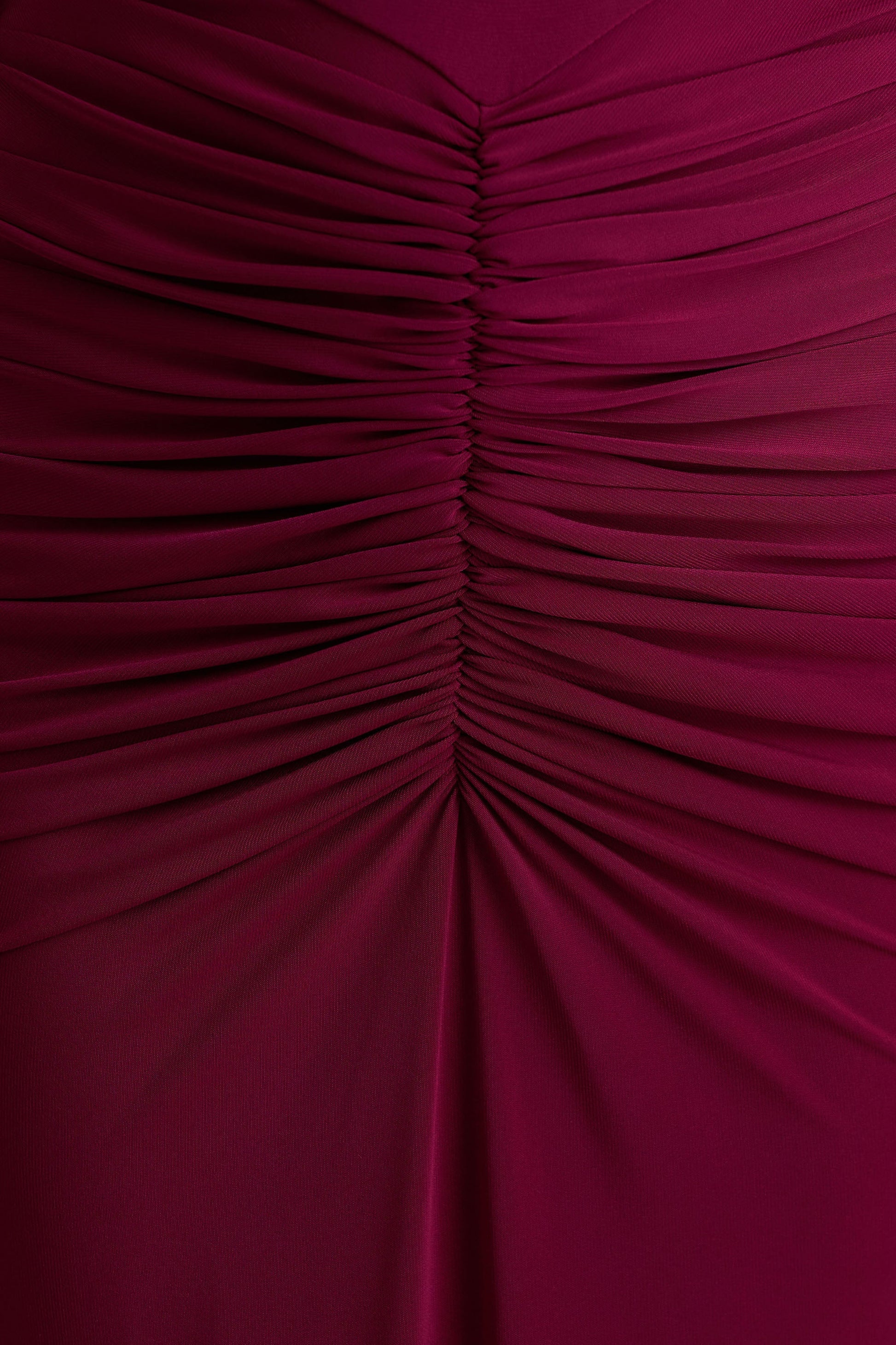 Make your entrance unforgettable in Premiere, a gown designed to captivate from every angle. Crafted in our premium burgundy stretch jersey, this maxi dress hugs and contours in all the right places, effortlessly sculpting your silhouette. Featuring a sophisticated boat neckline and dramatic cape sleeves, Premiere brings red carpet energy to any occasion. The open back adds a touch of allure, while ruched detailing flatters your figure with luxe texture. This floor-sweeping gown is your go-to for black-tie moments, galas, and all things glam.