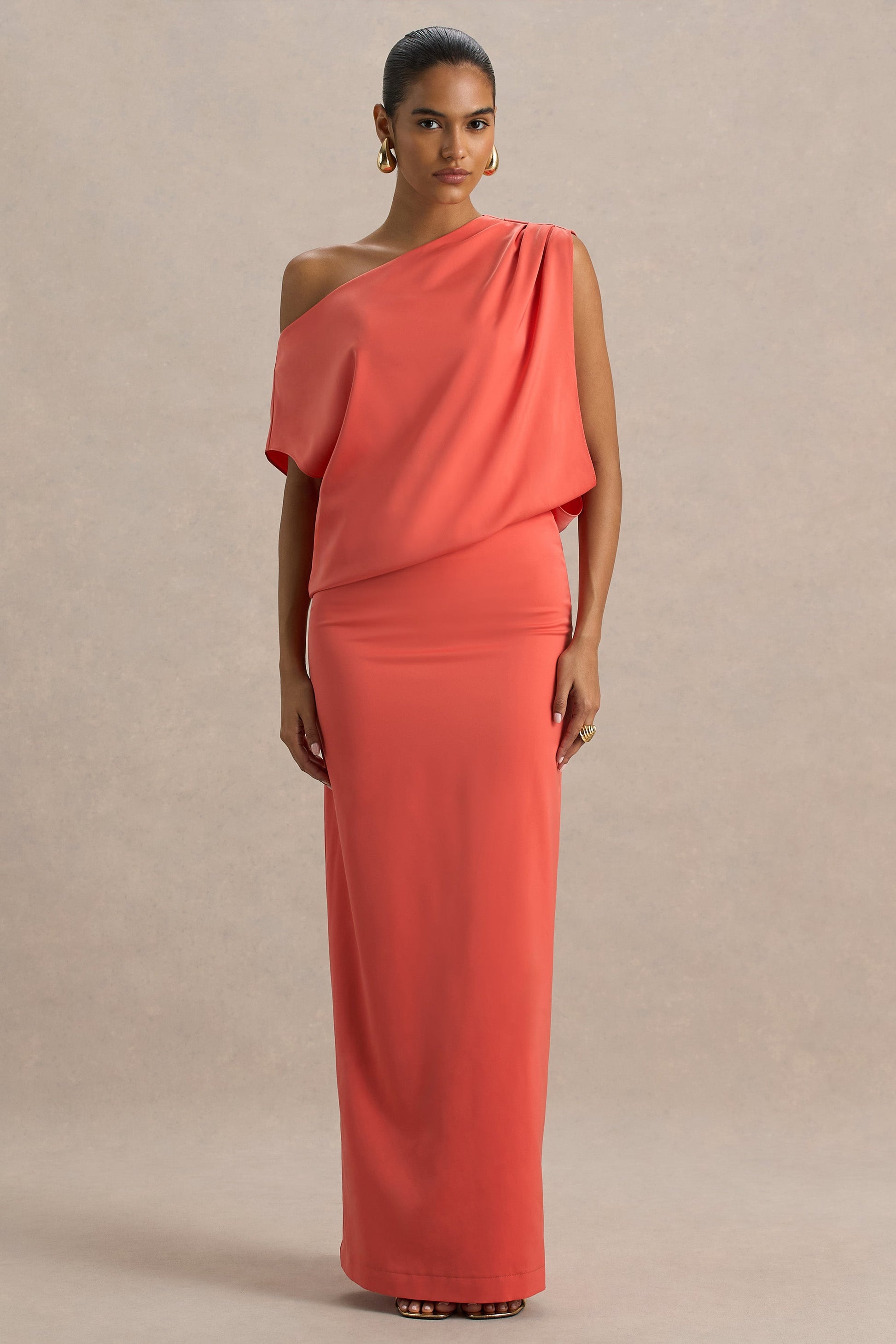 Ronnie | Coral Satin Asymmetric-Neck Maxi Dress With Draping Detail