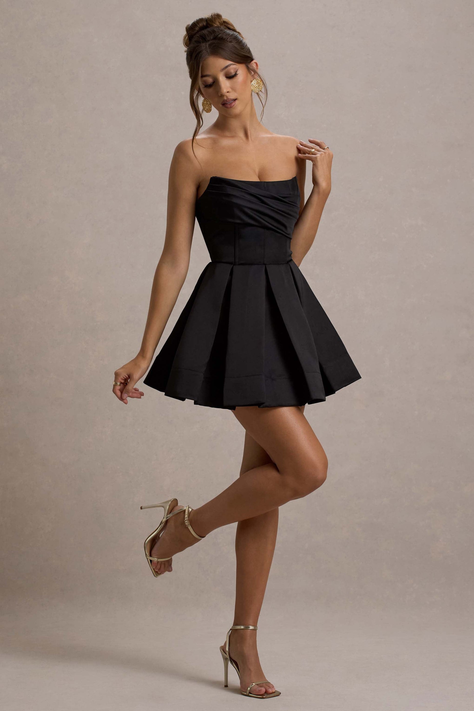 Elevate your LBD collection with the addition of our playful mini, Saira. Crafted in a luxurious satin, this strapless staple boasts a curved bandeau neckline, internal boning and a contemporary pleated skirt. For the perfect girls night out ensemble, style Saira with some big bouncy curls and stilettos like Nostalgia.