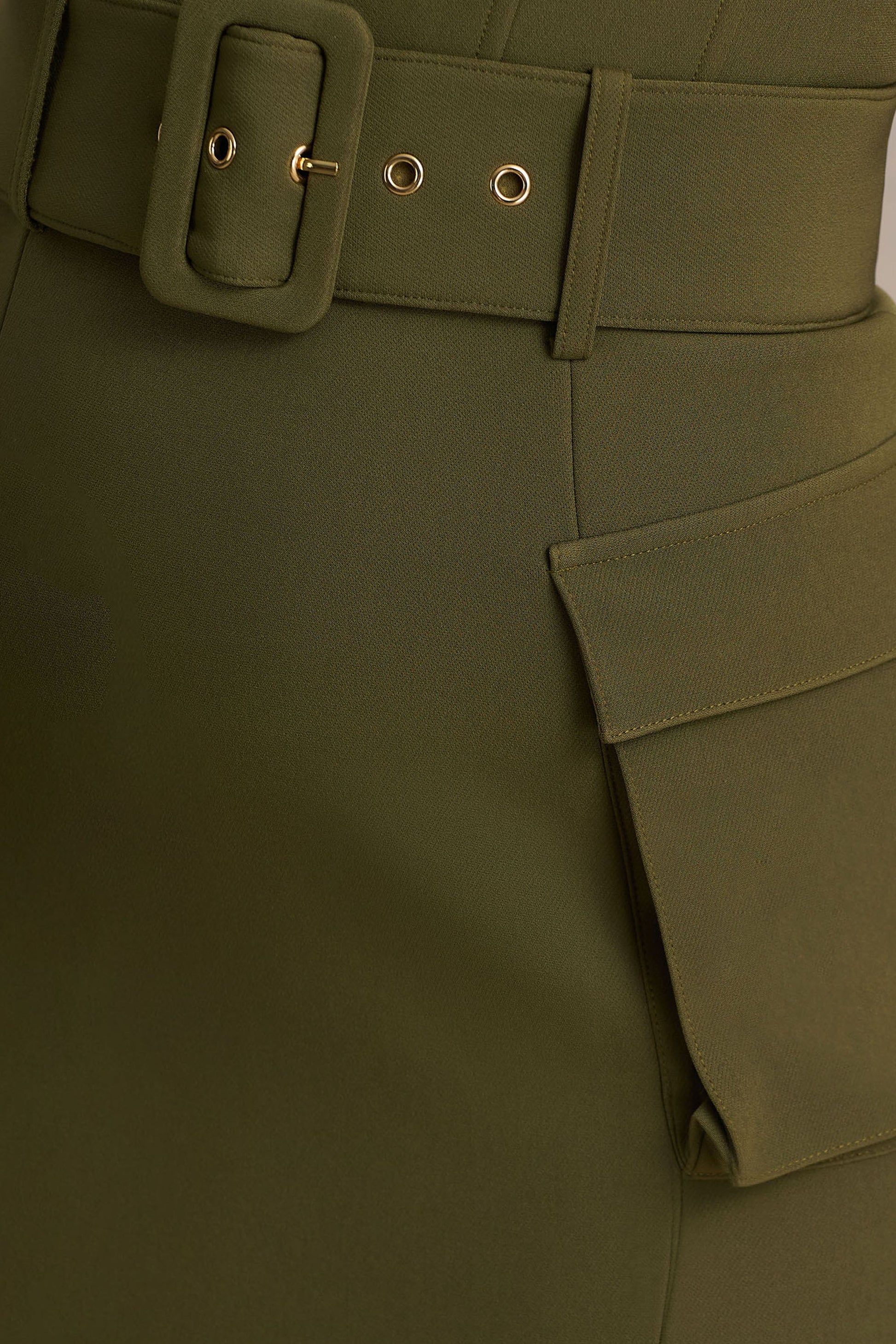 Step into the spotlight with Sandra a dress that exudes effortless elegance with a hint of daring edge. Crafted in our premium olive stretch crepe, it skims the body enhancing ever curve. The square neckline frames the décolletage beautifully, while the gold-detailed belt cinches the waist to create a flattering, feminine silhouette. Front pockets add a modern, functional touch, and the open back introduces a hint of allure. Finished with a front-high split, Sandra is a show-stopping piece made for unforgettable evenings.