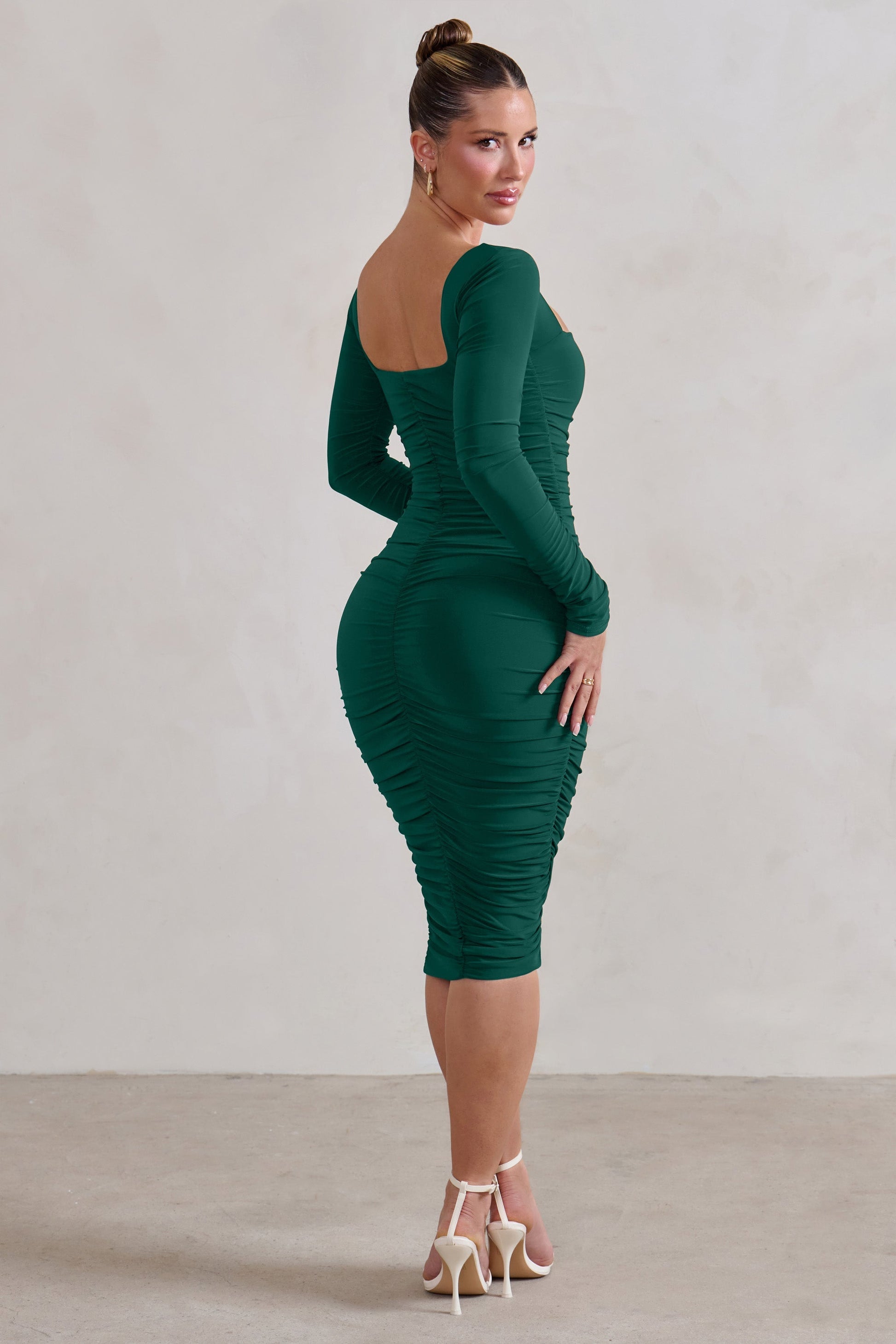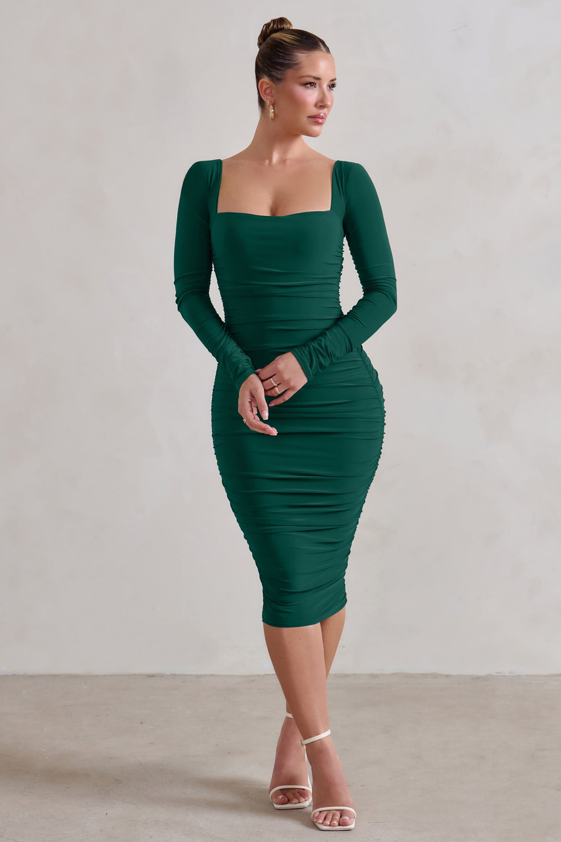 Seductress | Bottle Green Square Neck Bodycon Midi Dress With Long Sleeves