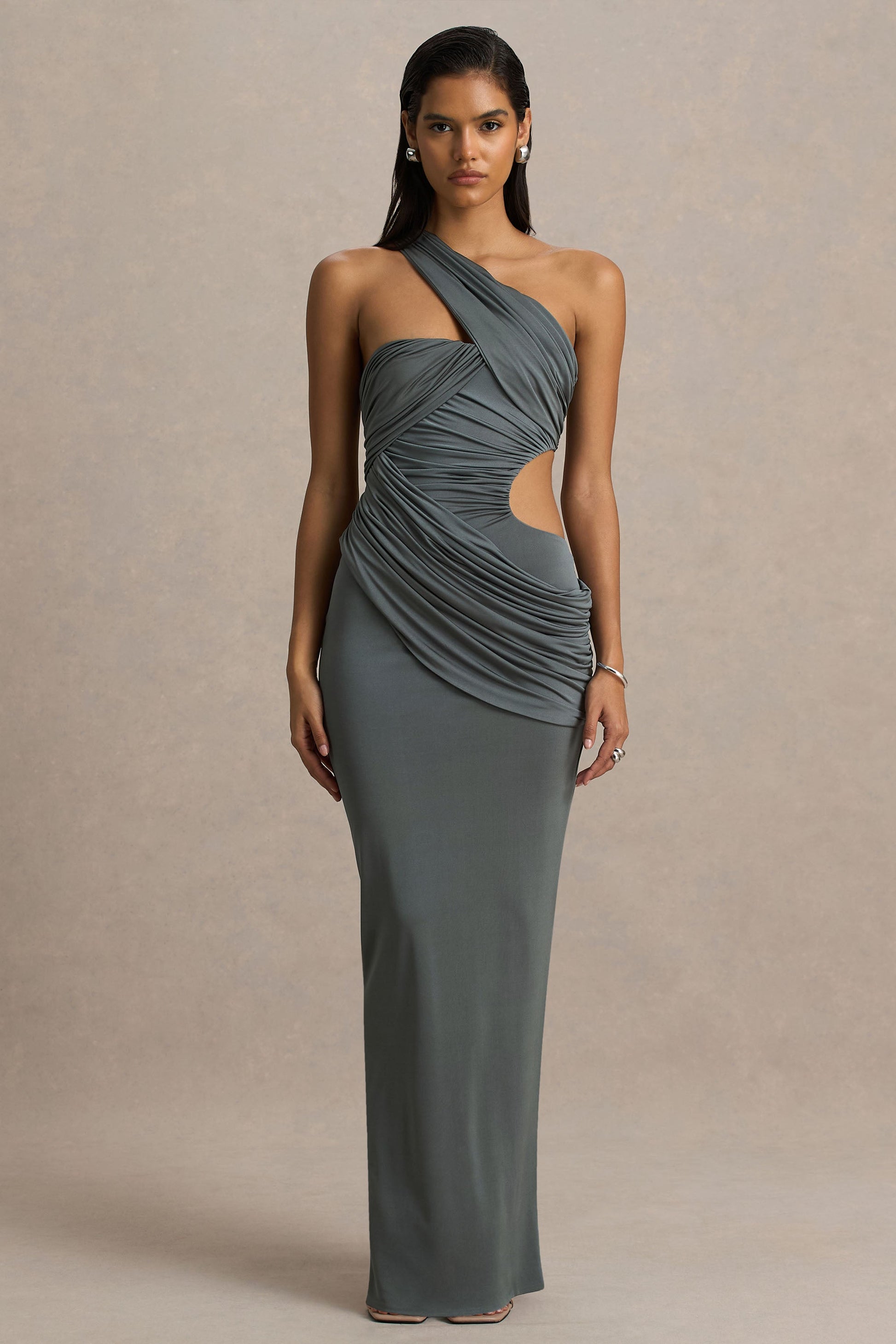 Serefine | Grey Asymmetric-Neck Maxi Dress With Body Cut-Out