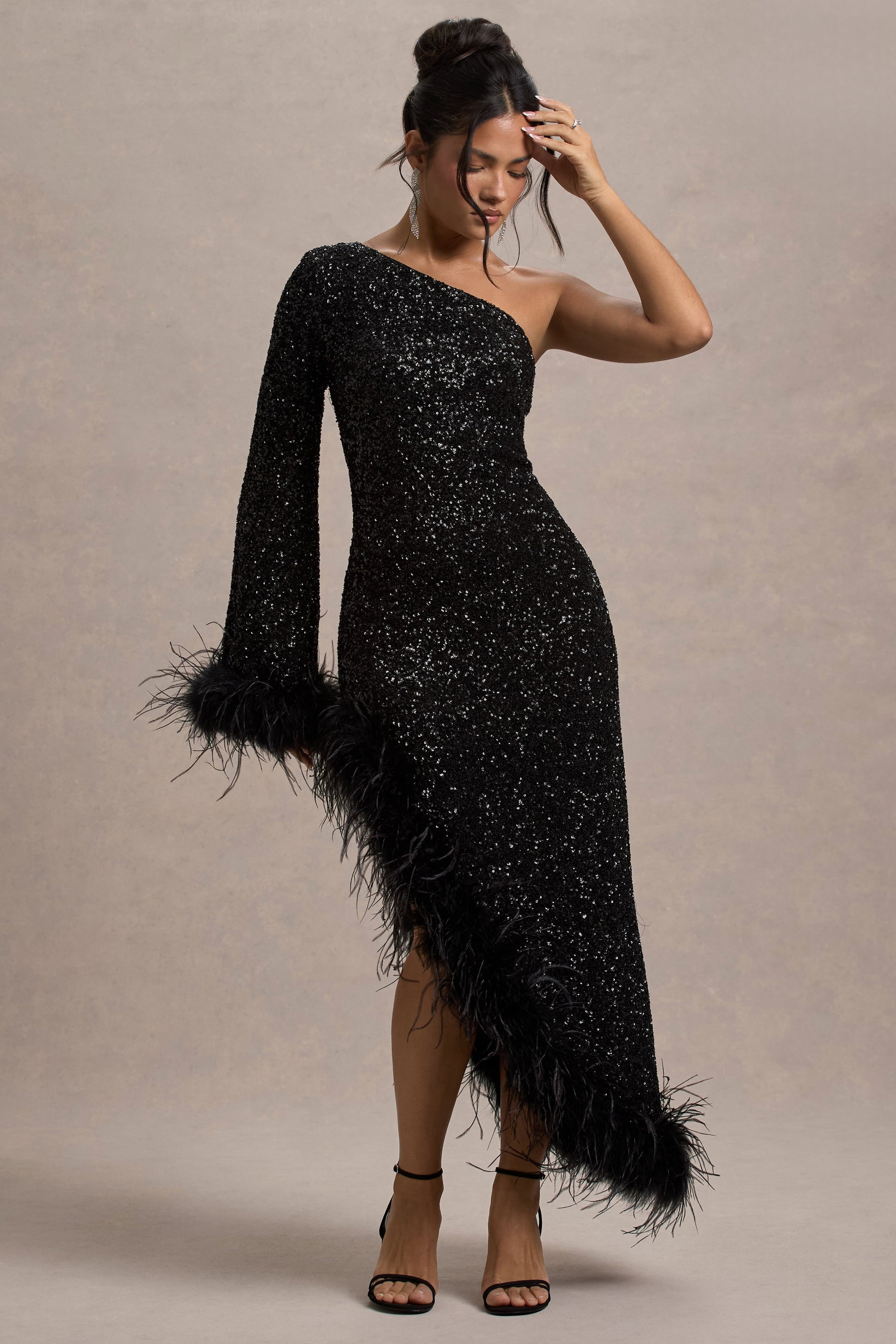 Shadow | Black Sequin One-Shoulder Feather Trim Maxi Dress