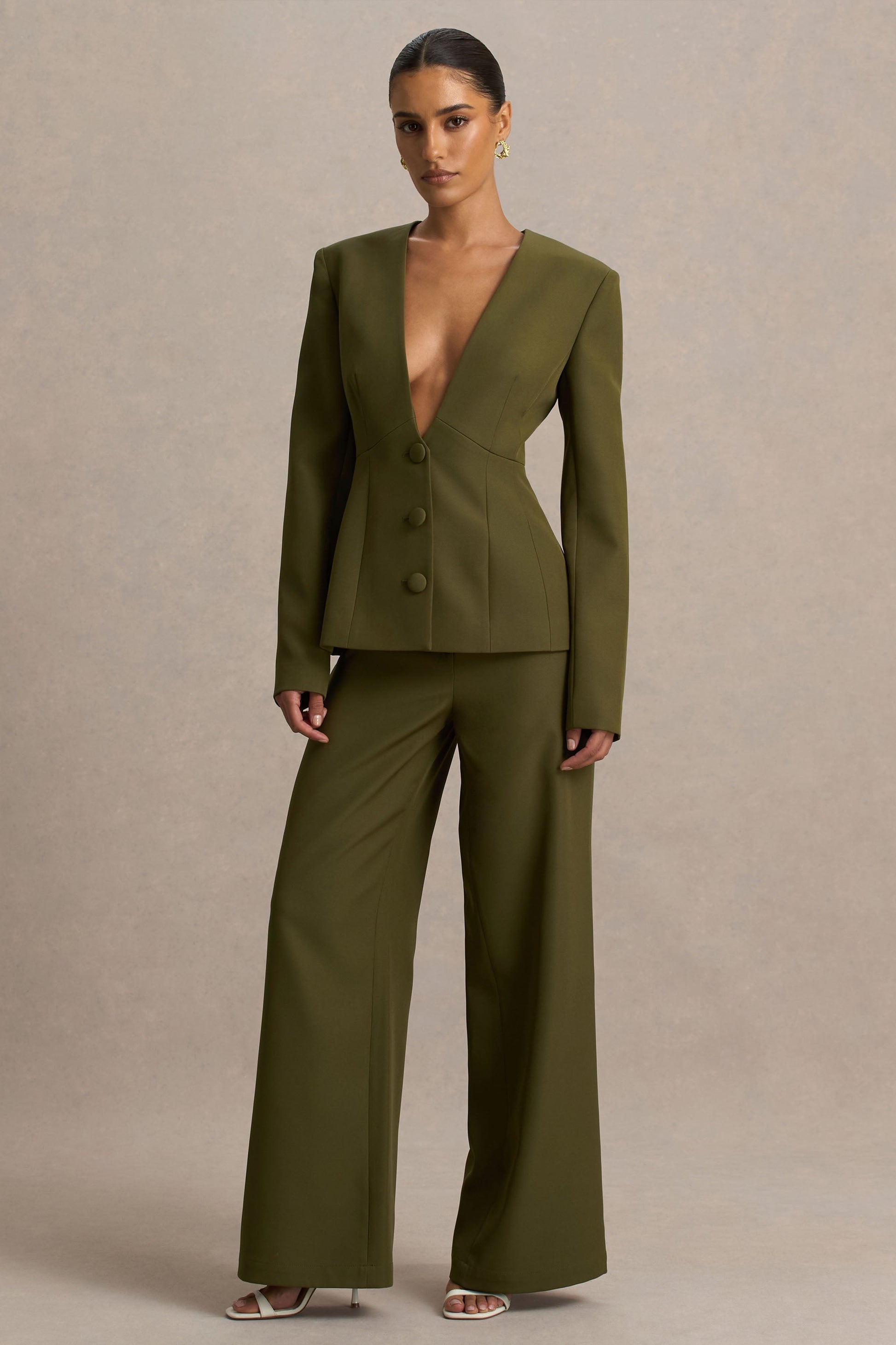 Introducing Silvia, a versatile wardrobe staple that's tailored to perfection for modern elegance. Crafted from our premium stretch crepe in a classic olive hue, these trousers are designed to flatter while exuding timeless sophistication. Featuring angled pockets that nod to sleek tailoring and a fluid wide-leg silhouette that elongates the frame, Silvia transitions seamlessly from desk to dinner. Pair with our Rosalina blazer for a look that'll command attention.