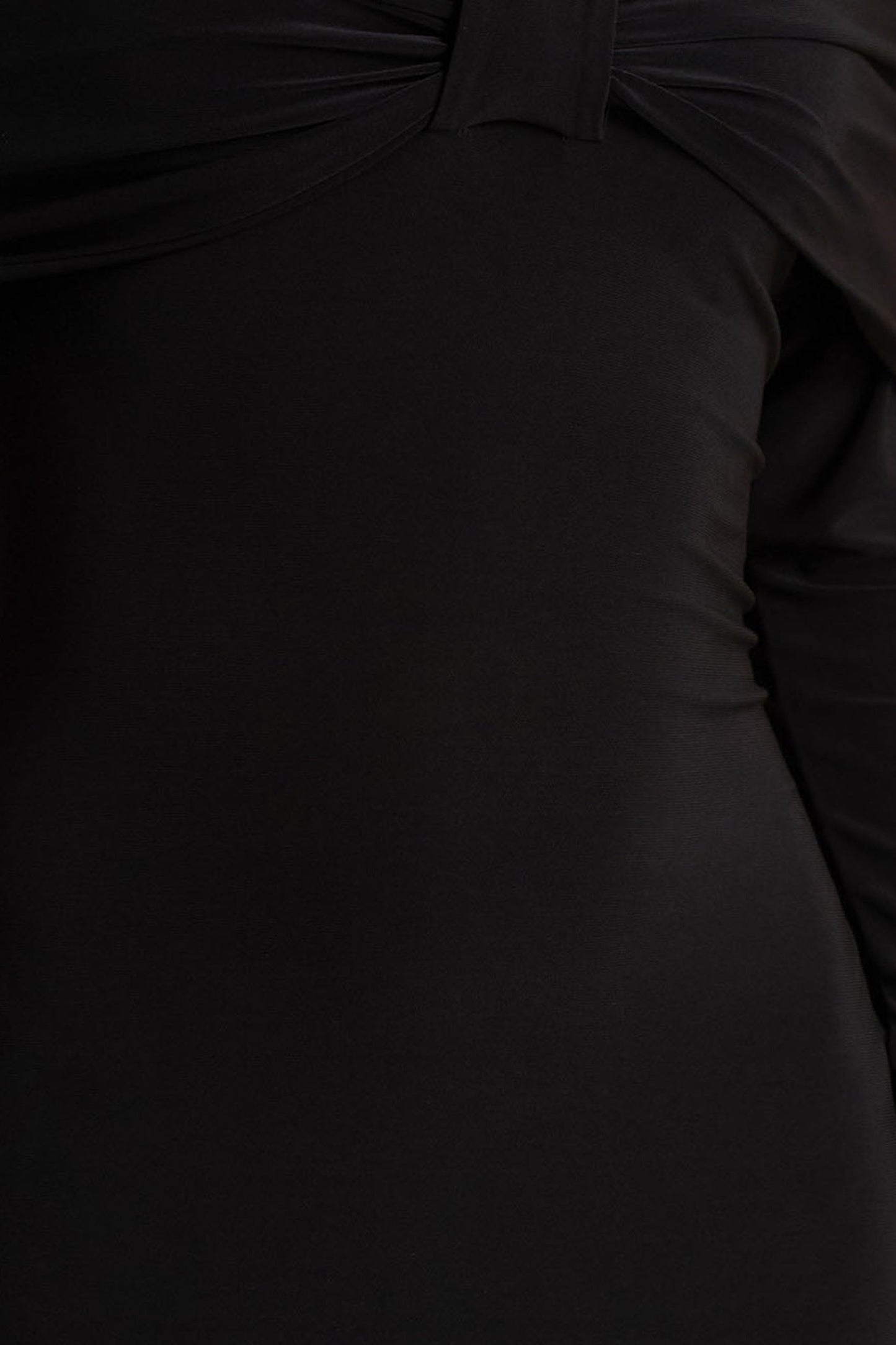 Turn heads effortlessly in Spark, a dress designed for unforgettable entrances. Cut from our premium stretch jersey in a rich black hue, this midi-length piece sculpts your figure while offering a luxurious edge . The elegant bardot neckline frames the décolletage, complete with a delicate bow detail for a touch of femininity. The long sleeves and ruched detailing enhance the sleek silhouette, while the centre-back split ensures ease of movement with a hint of allure. Effortlessly chic, Spark is the definition of understated glamour.