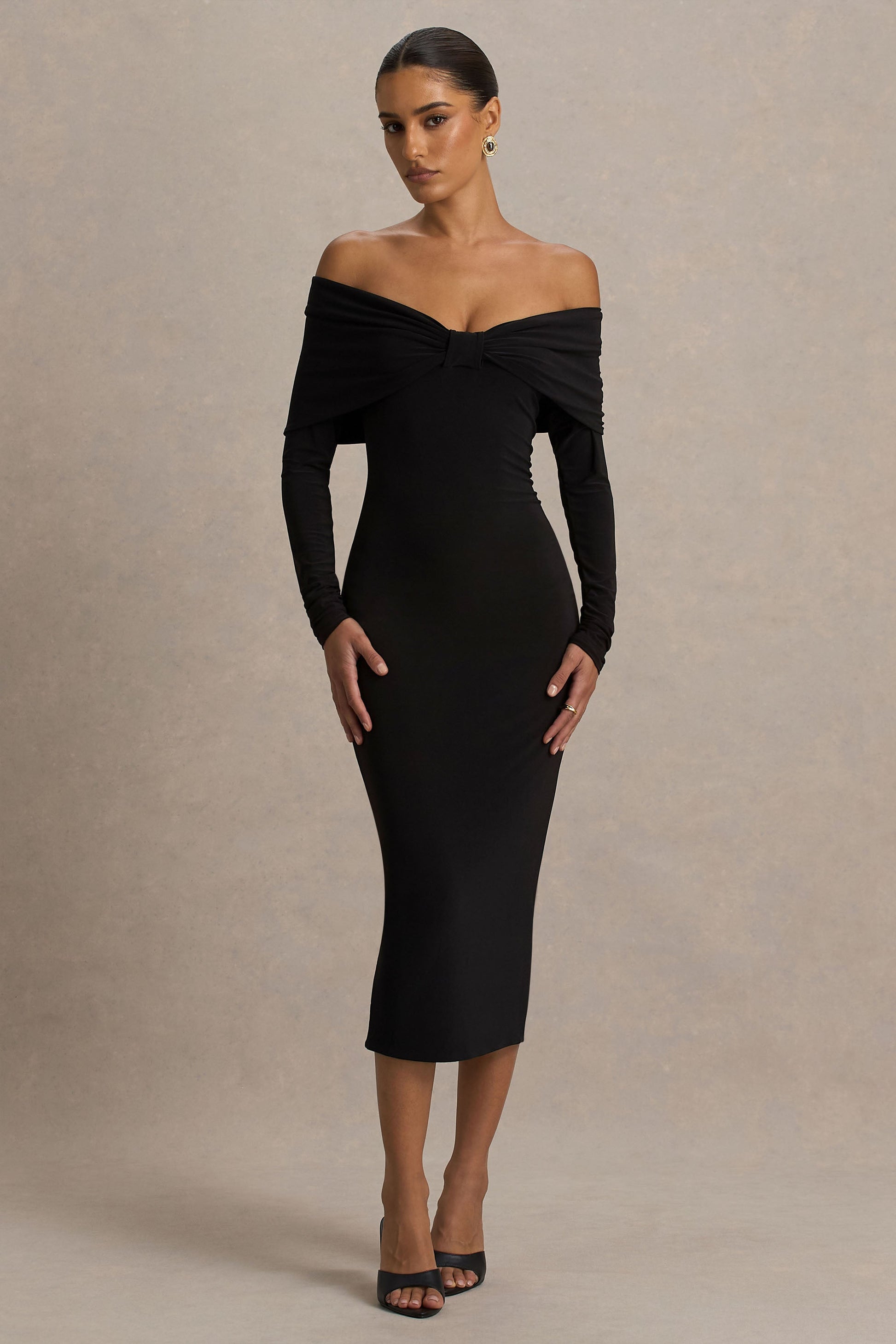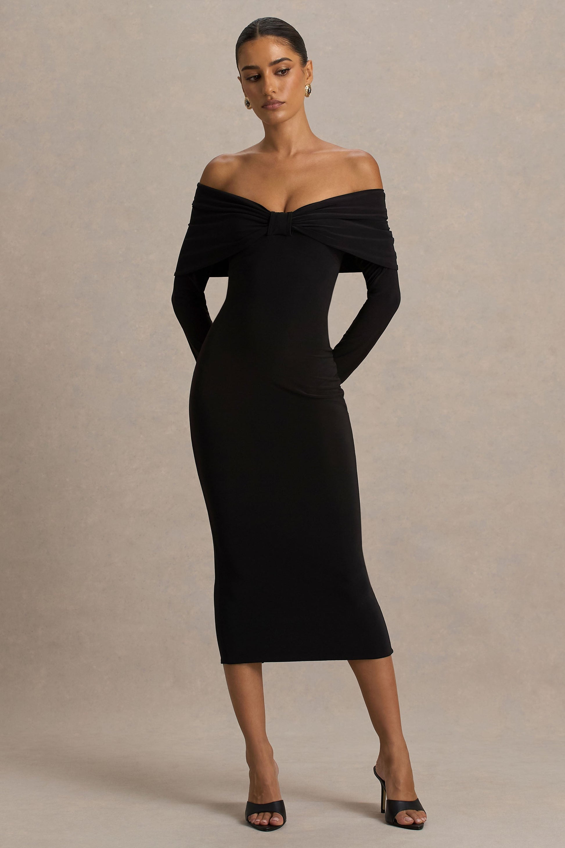 Spark | Black Bardot-Neck Midi Dress With Bow Detail
